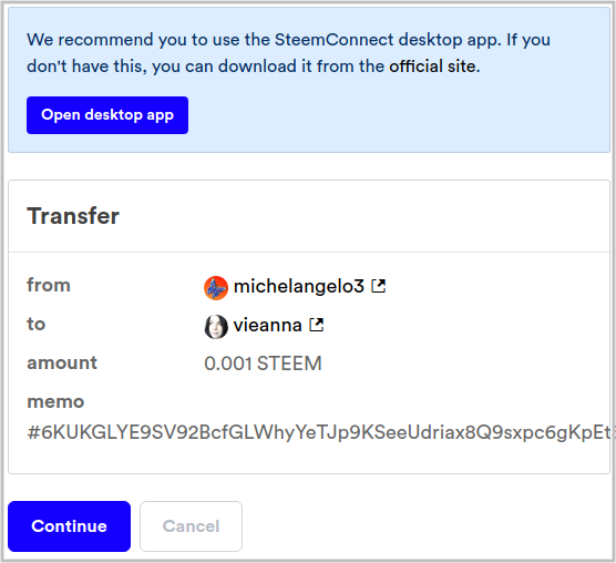 Jetzt landen wir bei Steemconnect (oder KeyChain) mit "Continue" geht es weiter.