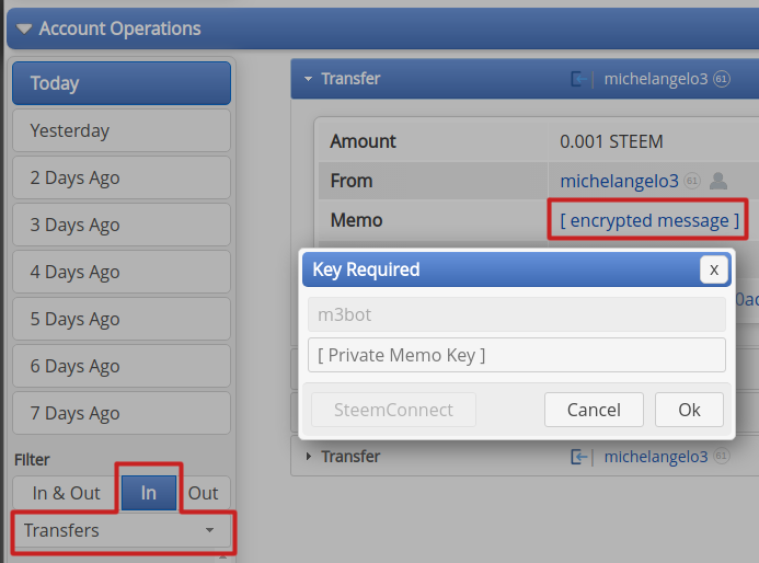Unter Steemworld.org geht es unter Account Operations. Damit man das Memo schneller findet, kann man den Filter auf In und Transfers stellen. Im erscheinenden Fenster ist wiederum der Private Memo Key einzugeben...