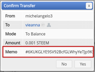 Hier kann man nochmal kontrollieren, ob die Memo verschlüsselt wird. Steht im Feld "Memo" der Reintext, hat man den Haken bei "Encrypt Memo" im vorigen Fenster vergessen. Bei uns passt es, also weiter mit "Yes".