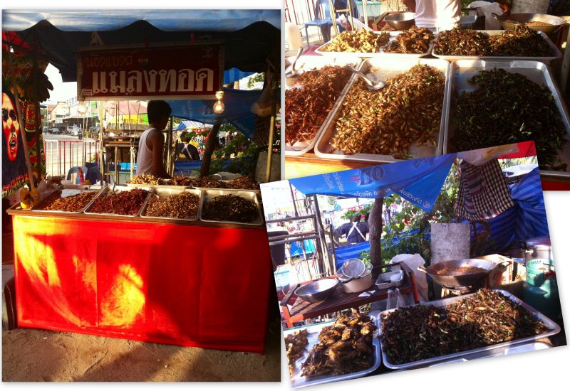 Meine Liebste und ich saßen in Bangkok am Rande einer Kneipe, hatten ein Bier in der Hand, als plötzlich dieses Gefährt an uns vorbei fuhr, in dessen Auslage ich die frittierten Biester entdeckte.