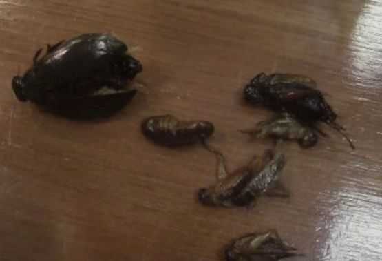Später im Hotel, die Tüte war fast fast leer und nur noch ein riesiger Käfer und ein paar kleine Insekten kullerten heraus auf den Tisch.