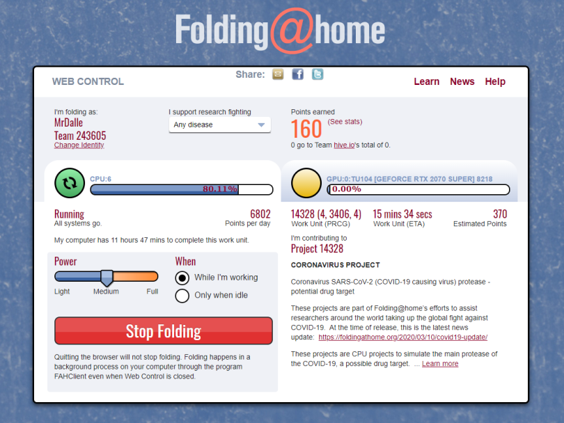 Mittels der App folding@home könnt ihr eure Rechenleistung der Wissenschaft zur Verfügung stellen.