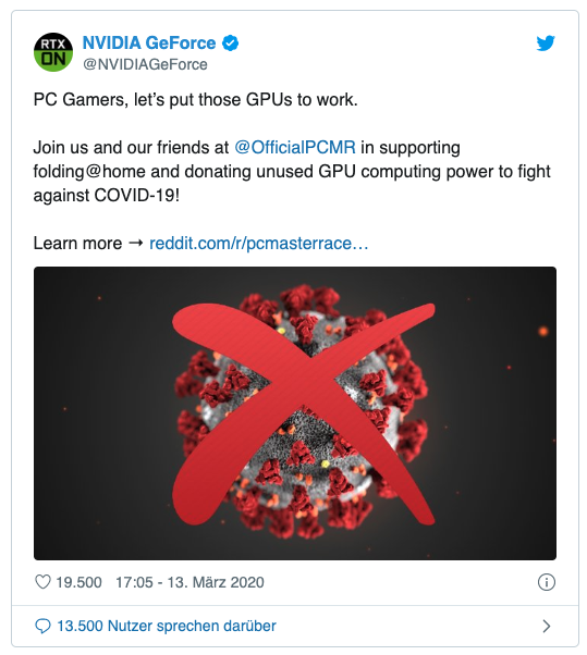 kürzlich bin ich auf einen Tweet von Nvidia gestoßen in dem der Hersteller und die Unterstützung eines jeden Gamers bittet. Jeder kann mit seiner leistungsstarken Hardware helfen! Die Forschung am Corona Virus ist ein sehr wichtiger Bestandteil für die Entwicklung eines Impfstoffes.