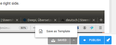 Bevor du ihn postest klickst du zuerst auf den kleinen Pfeil im grauen SAVED-Feld (das heisst, dass Steempeak deinen Beitrag automatisch - in Intervallen - gespeichert hat). Dann öffnet sich darüber ein kleines Popup mit dem Text Save as Template. Da klickst du drauf und schon hast du den Beitrag als frei änderbares Template in deiner Templates-Liste.