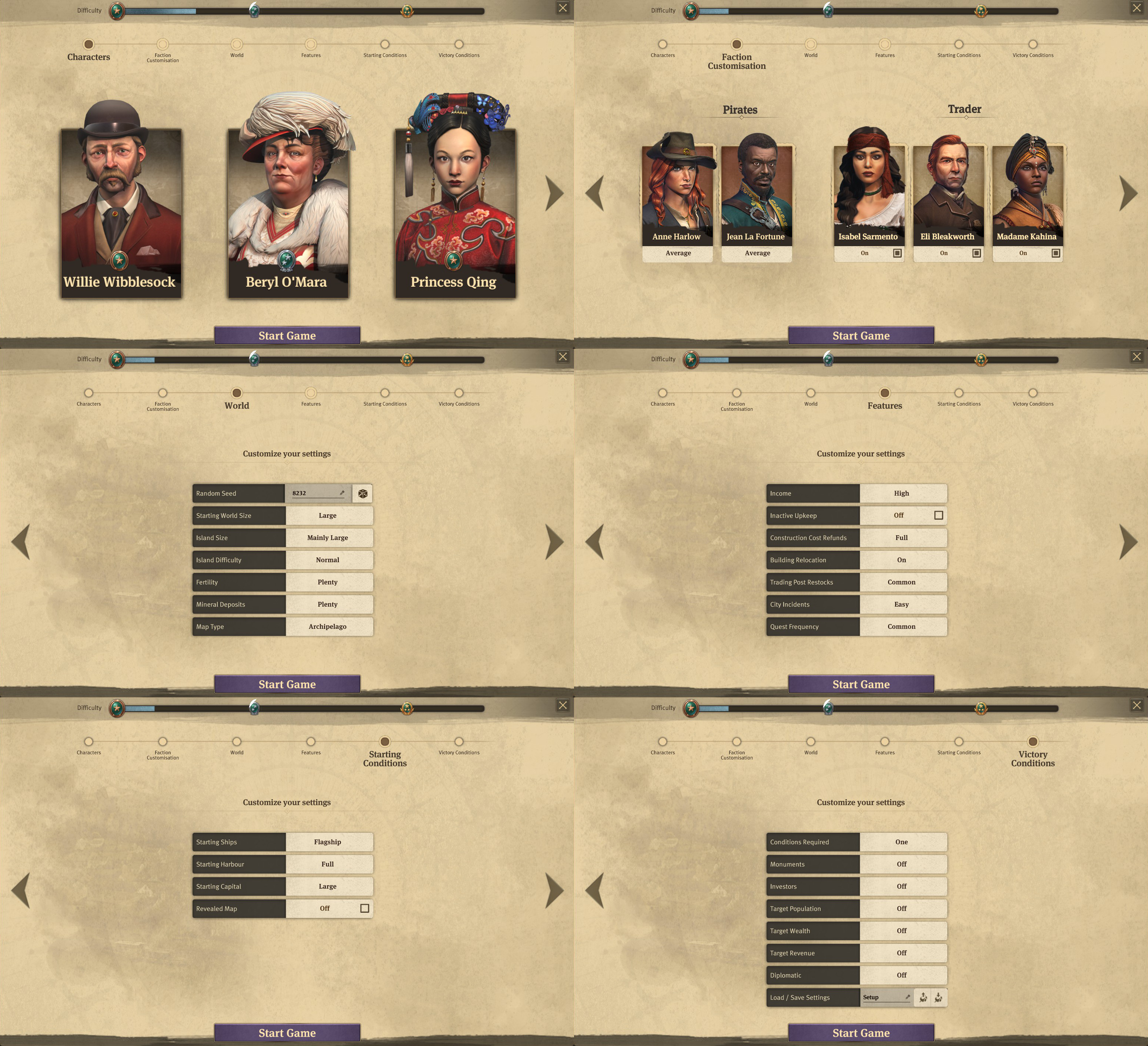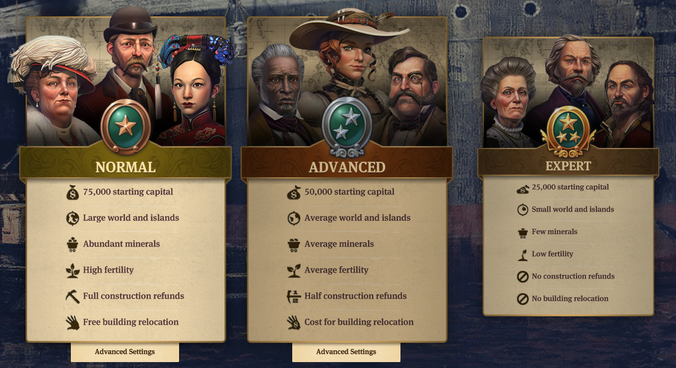 Nun wählt man sein Charakter, seine Flagge und Farbe aus. Jetzt kann man den Schwierigkeitsgrad auswählen oder selbst einen über Advanced Settings entstellen.
