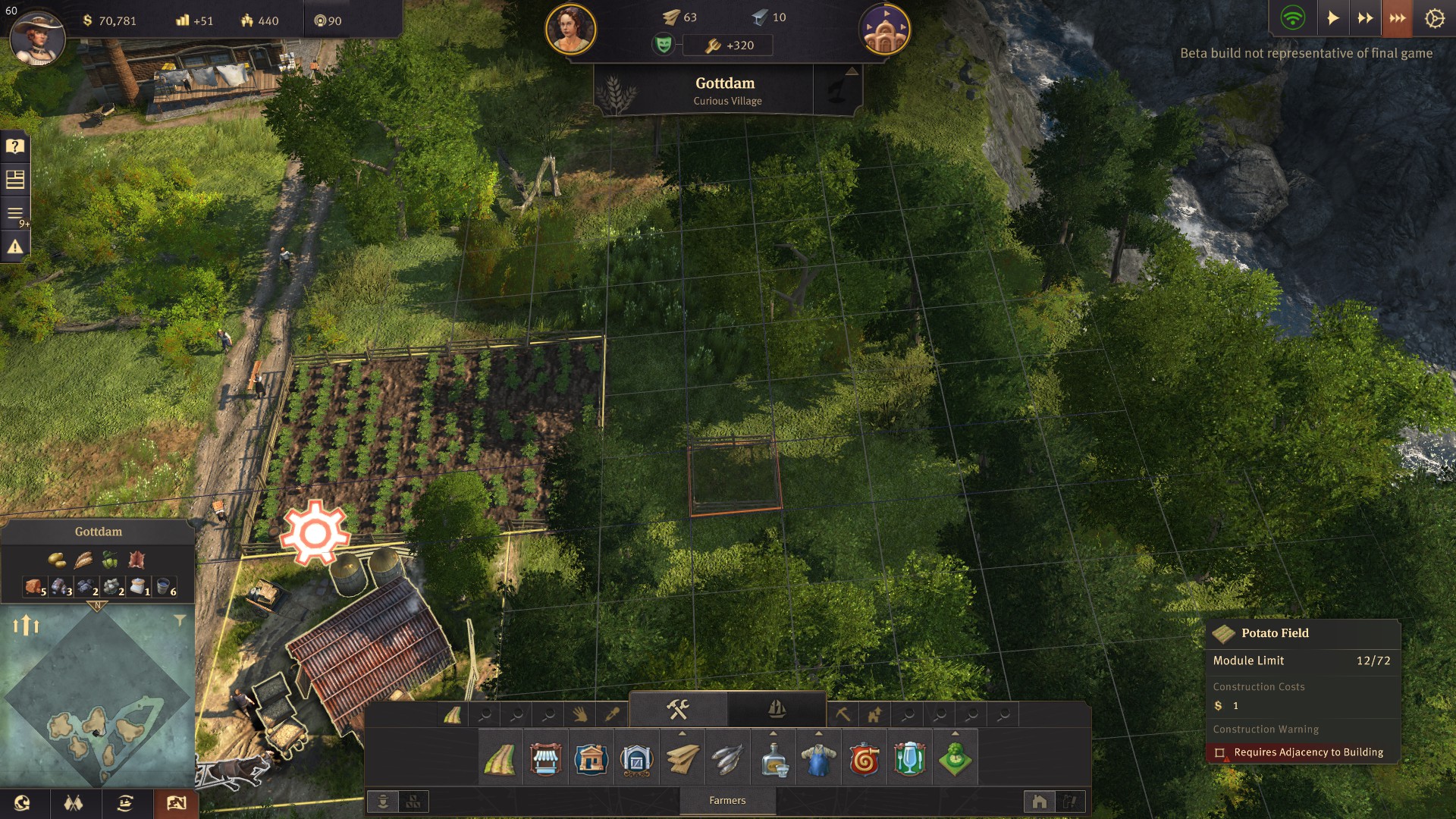 Nun kommt die Agrarproduktion. Man kann Felder freier verlegen, man muss aber beachten, dass die Felder nicht größer als 1*1 Kästen sind. Wenn man also ein großes Feld haben will, muss man mühselig die Kästen einzeln platzieren. Dafür brauch man halt gleich mal 72 Kartoffelfelder anstatt z.B nur 5. Leider ist das bei der Viehzucht noch nicht so vorhanden.