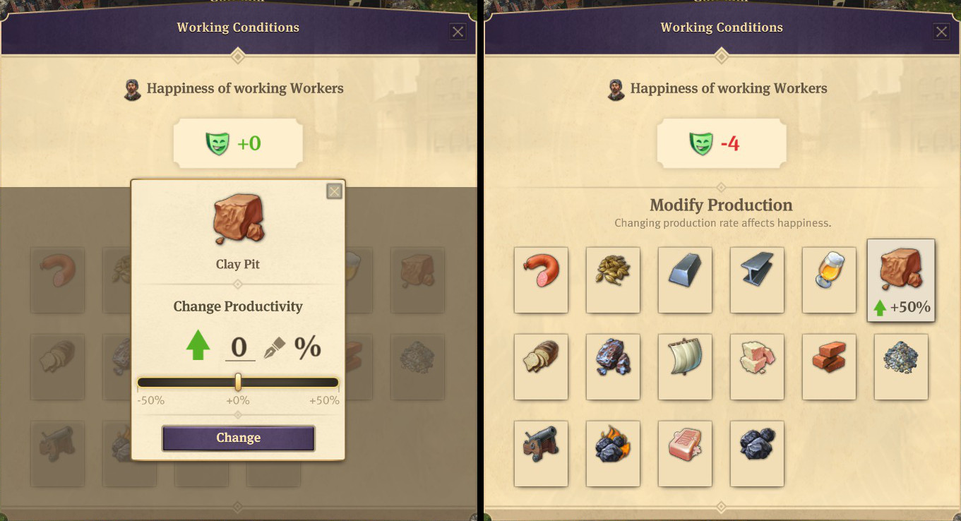 Ein weiteres neues Feature ist, dass die Bürger mehr arbeiten müssen um die Produktion zu erhöhen, was die Bürger natürlich überhaupt nicht geil finden (Oh Mimimimi). Um die Bürger glücklich zu machen, muss die Arbeitslast daher runter geschraubt werden, natürlich im Nachteil zur Produktion. Sprich weniger Zeug, dafür happy Sklaven.