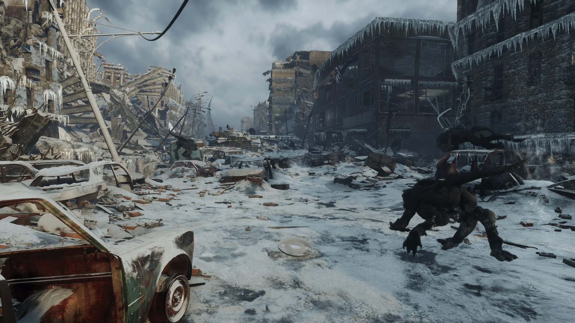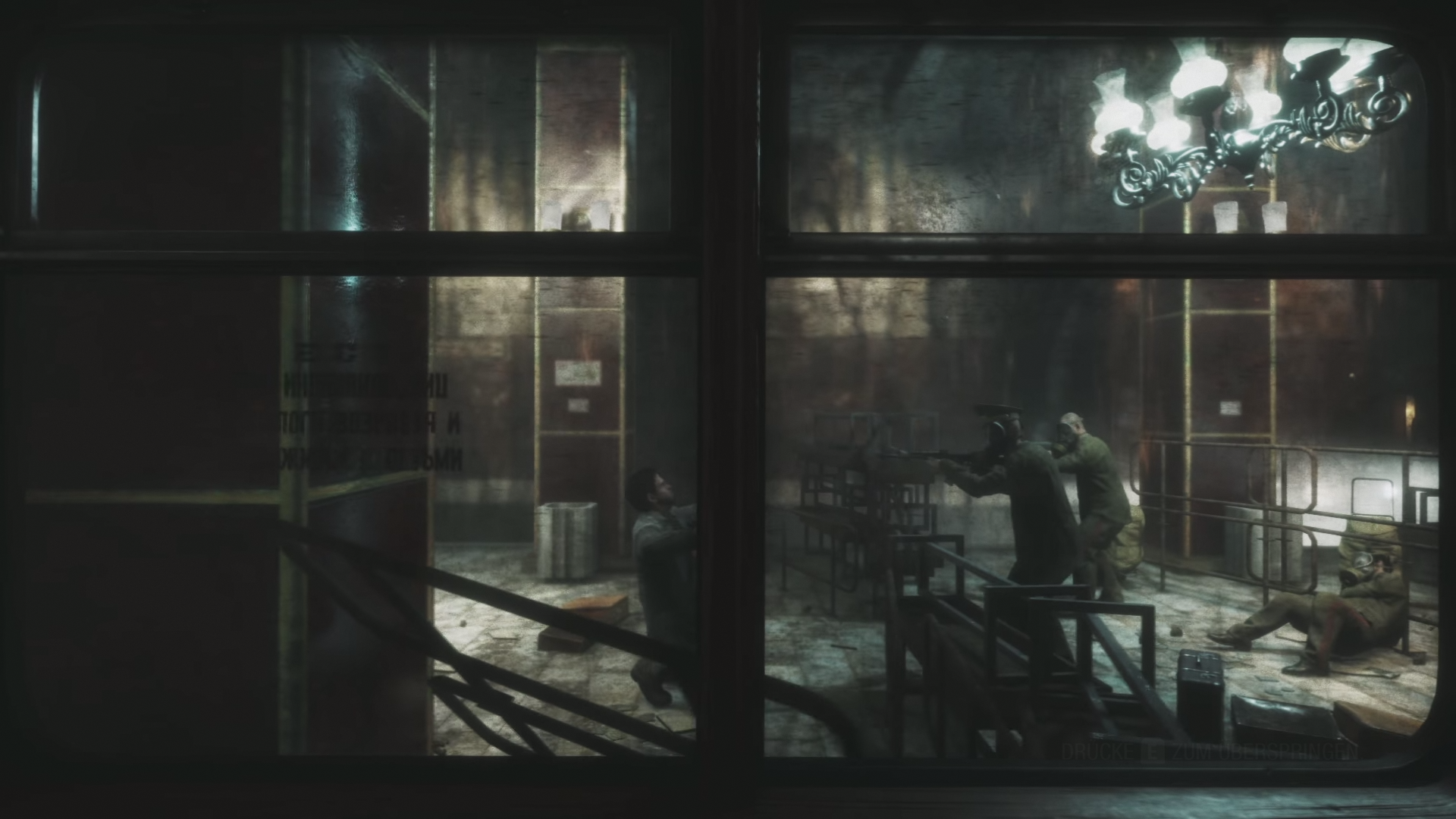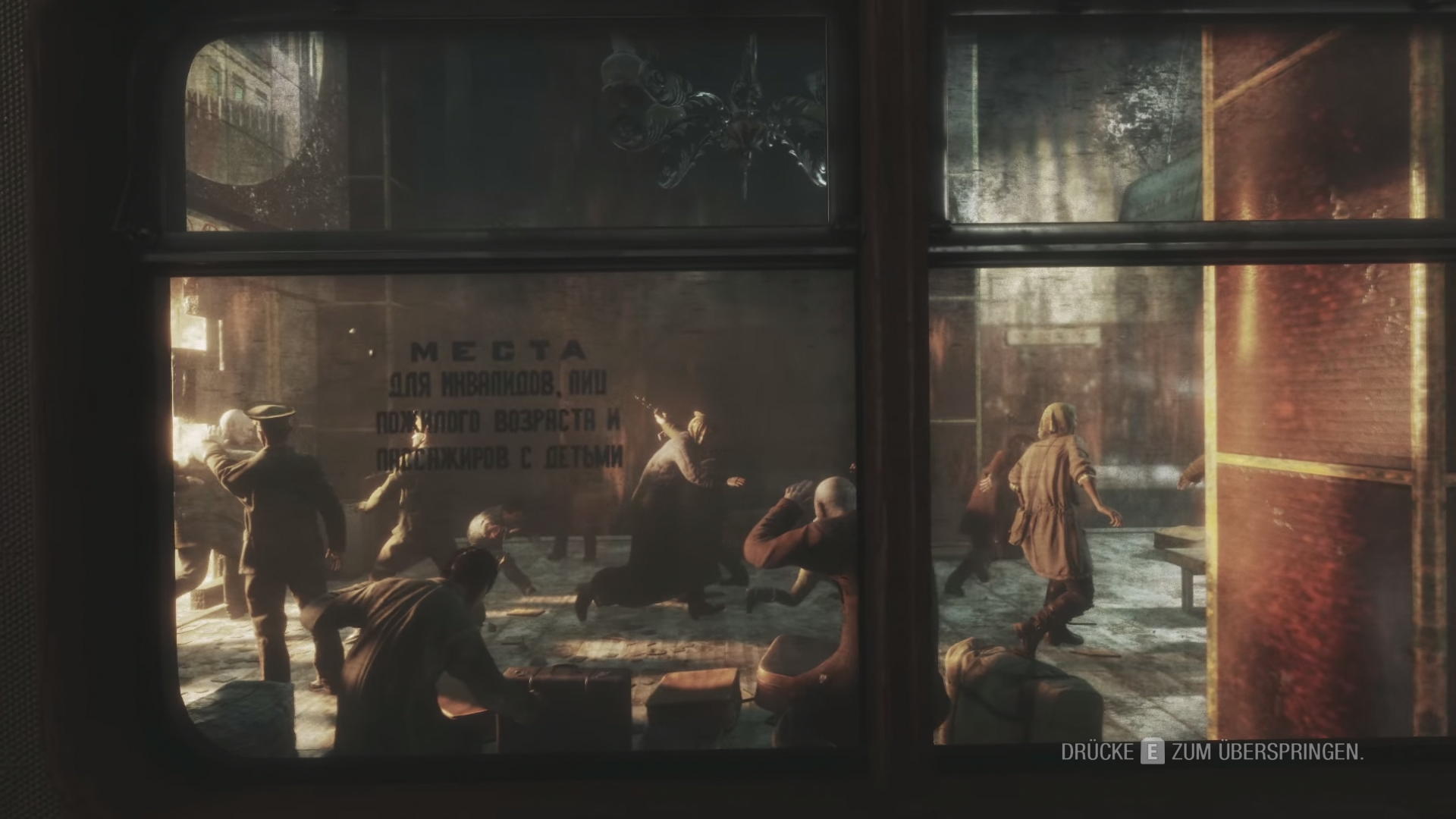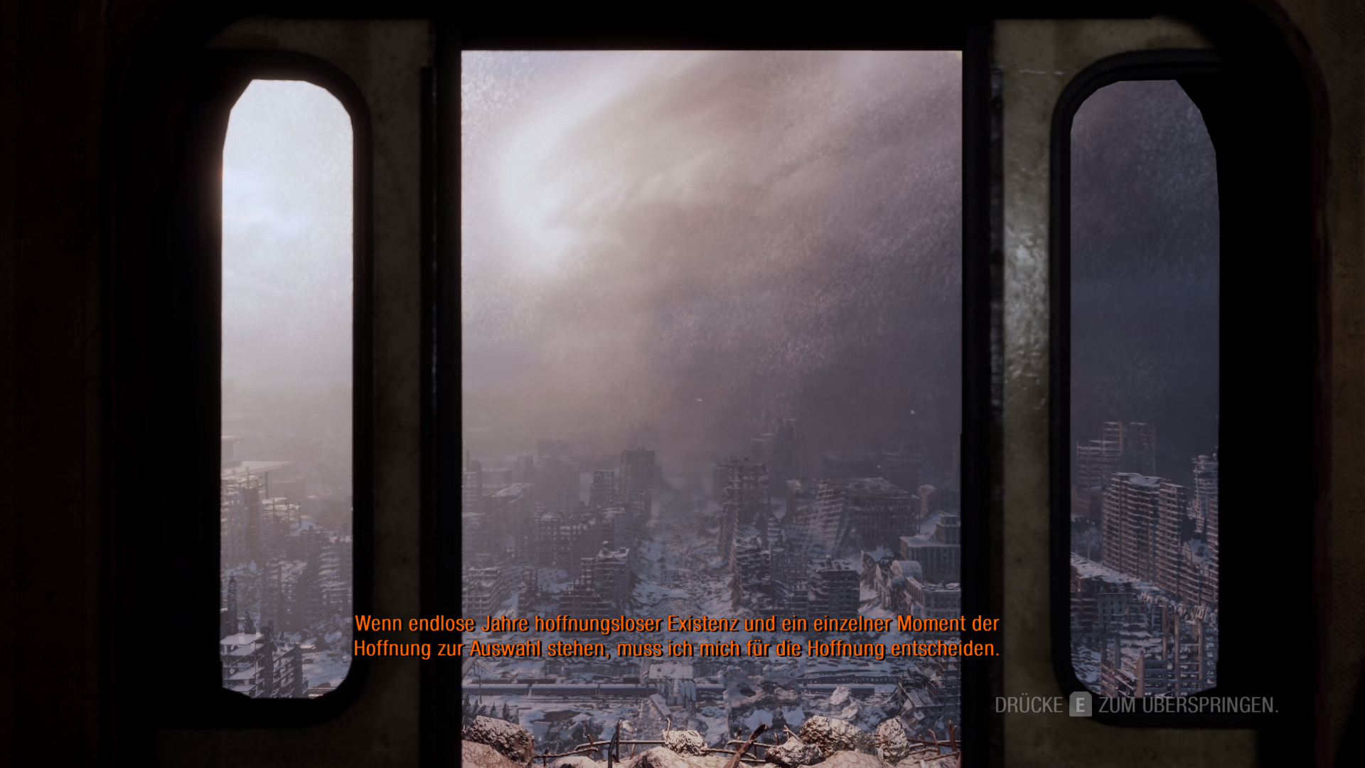 Nachdem man ein neues Spiel beginnt, startet eine Zwischensequenz. In der erfahren wir von einen Erzähler (Artjom) zusammen gefasst die Geschichte der Metro und damit auch der Inhalt der ersten beiden Spiele. Dabei gehen wir scheinbar selbst in der Ego-Perspektive. Zum Schluss öffnen sich die Türen und unser Charakter steigt aus diesem Zug aus. Im Hintergrund befindet sich verfallene Stadt, sprich wir befinden uns an der Oberwelt.
