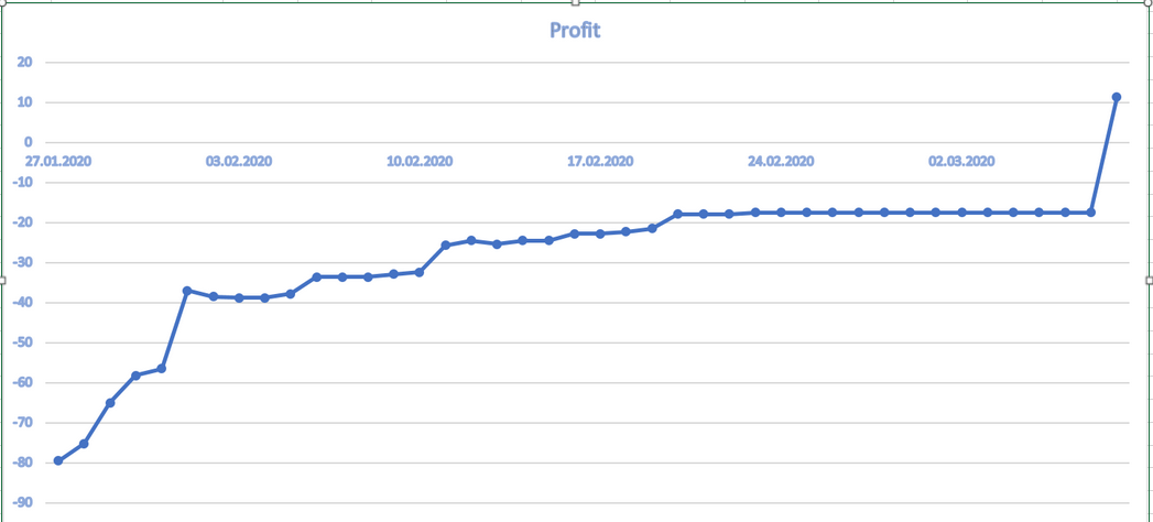 Jedenfalls bin ich nun etwa 11 Steem im Plus. In einer Excel Tabelle hatte ich Buch geführt, aber ein paar kleinere Ausgaben und Einnahmen ausgelassen. Insgesamt sieht mein "Profit-Diagramm" so aus: