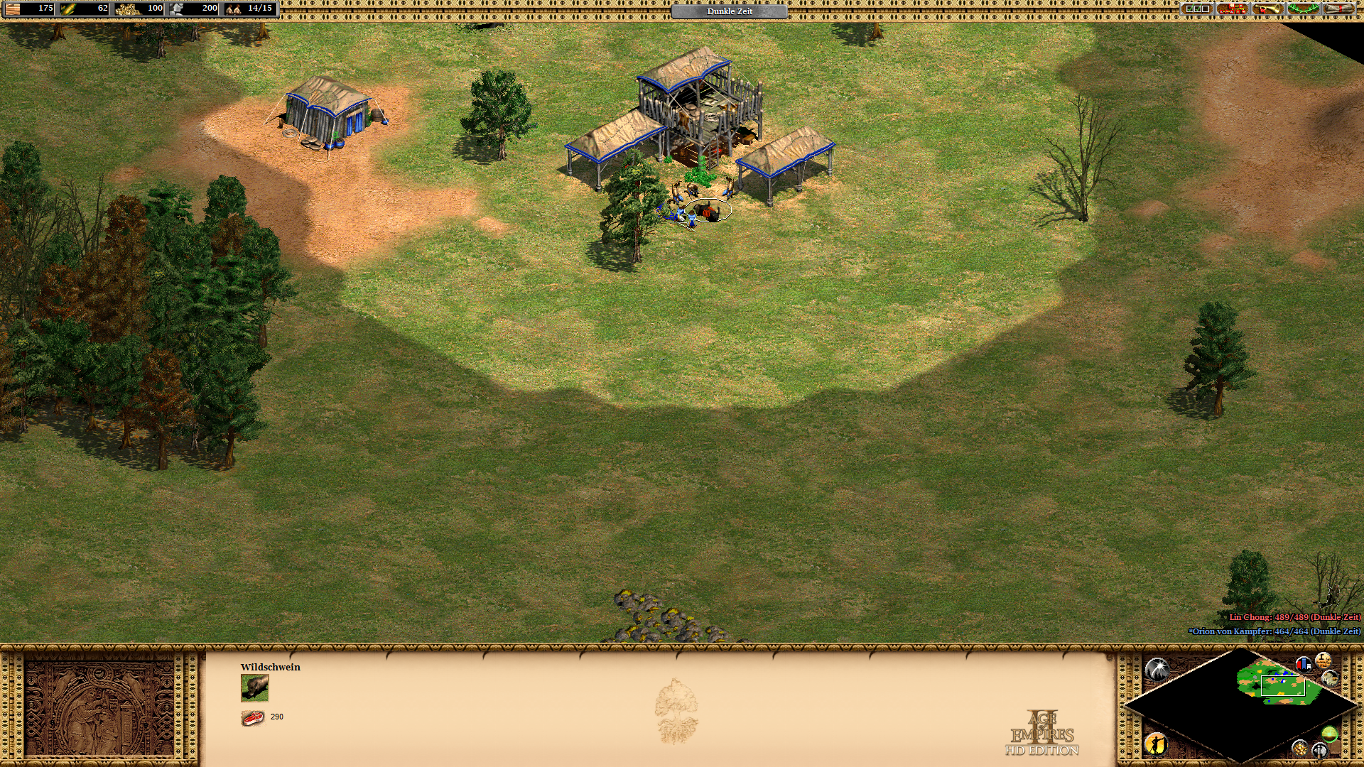 Nun wird ein Dorfbewohner zu einem Wildschwein geschickt, welches er zwei mal anschießen muss, damit es ihm zum Dorfzentrum zurück folgt (DE 1x). Der Dorfbewohner wird in das Dorfzentrum einquartiert, während die ehemaligen Schäfer das Wildschwein erledigen, wobei der Anschießer das Dorfzentrum sofort wieder verlassen kann, um sich ebenfalls als Jäger zu beteiligen. In der „Definitive Edition“ ist es sogar möglich das Wildschwein mit den Pfeilen des Dorfzentrums zu töten, ohne, dass die Nahrung verloren geht, wie dies vorher der Fall war.
