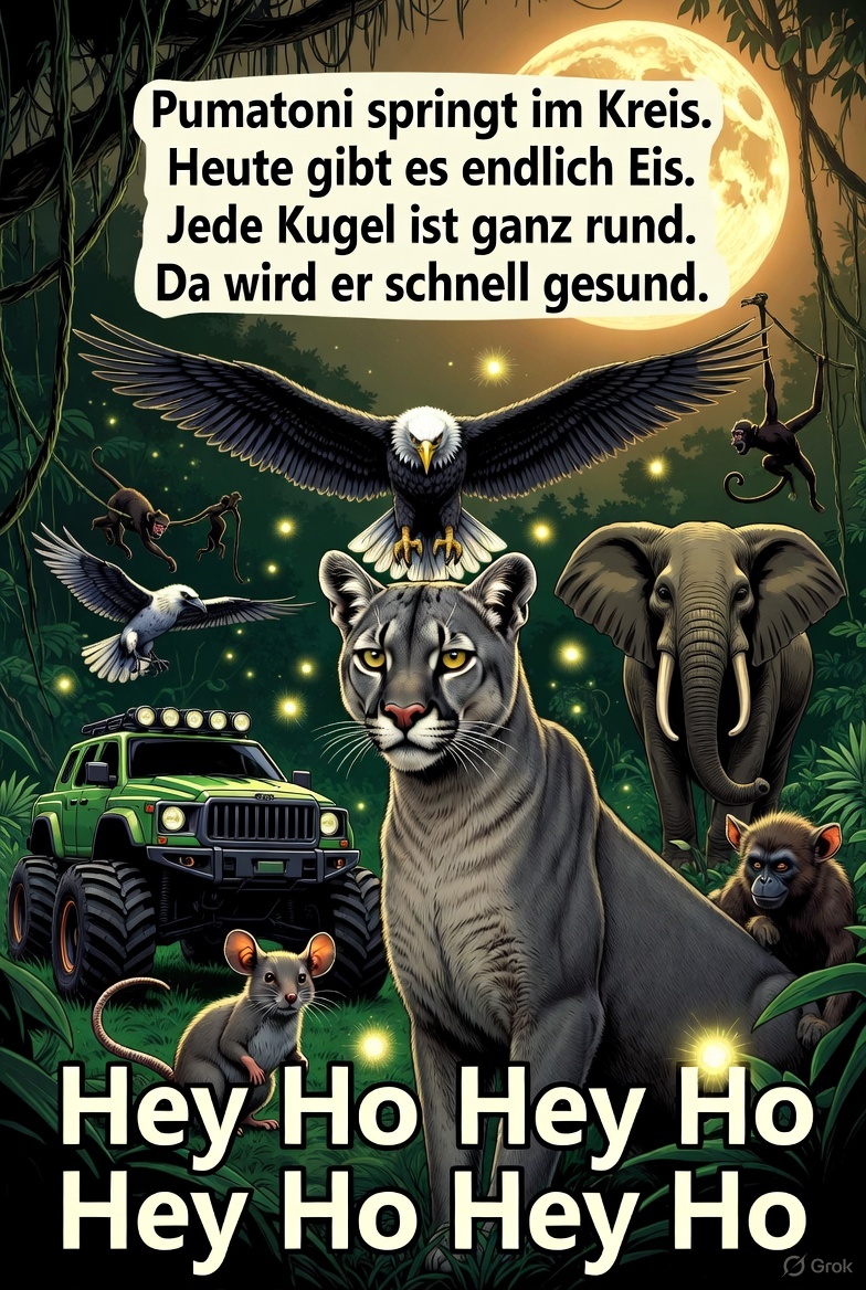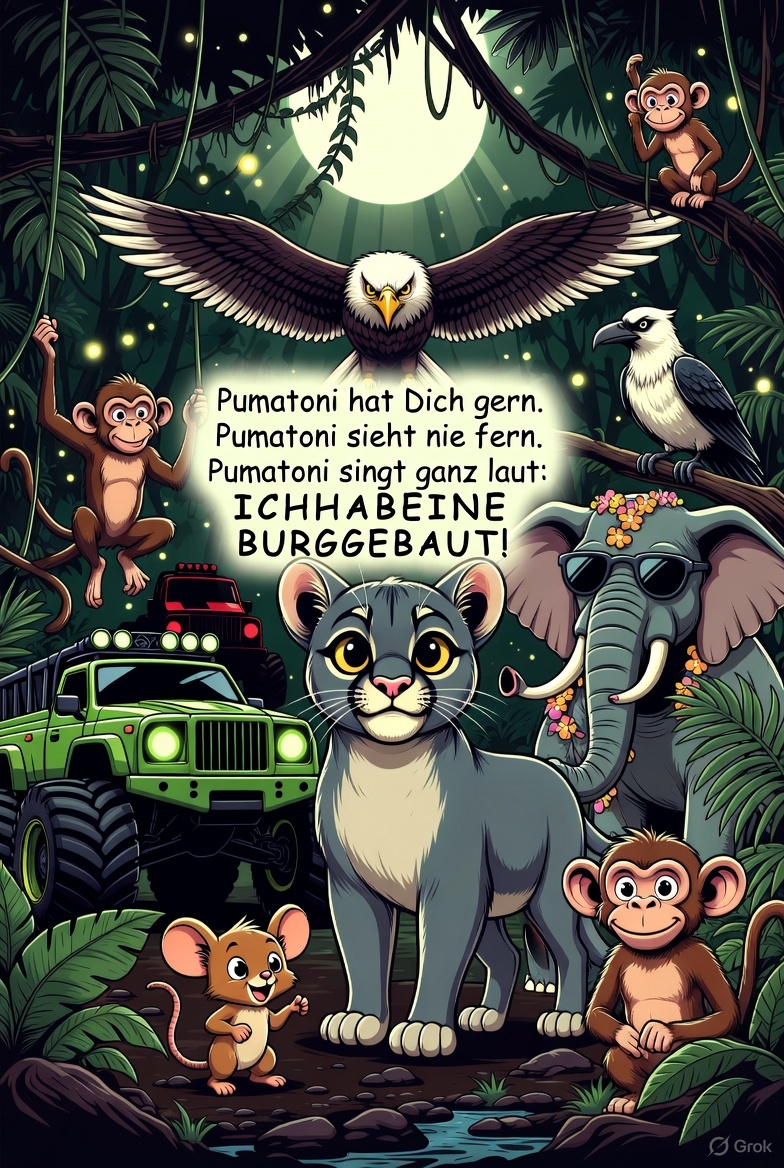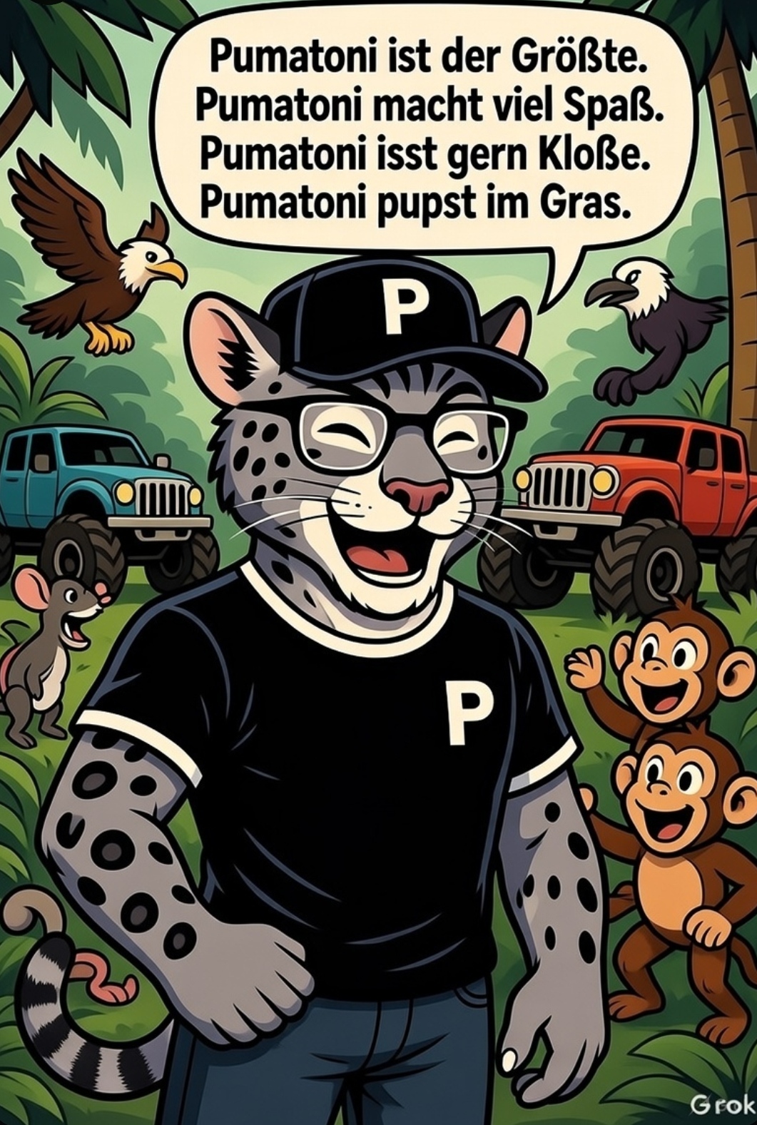 AHH du bist das👍👍 Ich dachte die Monstertrucks rasen durch den schönen Urwald..Na dann..Dann sind die Tricks eben die Beschützer. Total süss. Ich erfinde oft spontan Kindergeschichten, kann einfach frei raus erzählen als hätte ich ein Buch in der Hand. Natürlich klappt das nicht immer. Deine Geschichte hat ein Gesicht, ein total süsser Pumatoni. Vielleicht kannst du die Geschichten öffentlich machen, dann ein Buch mit RioRap Reimen und natürlich dürfen Stofftiere von Pumatoni mit Freunden nicht fehlen. Sehe schon alles bildlich vor mir. Bräuchte sicher eine riesen Investition vorweg und Verträge. Vielleicht wirst noch entdeckt. 👍