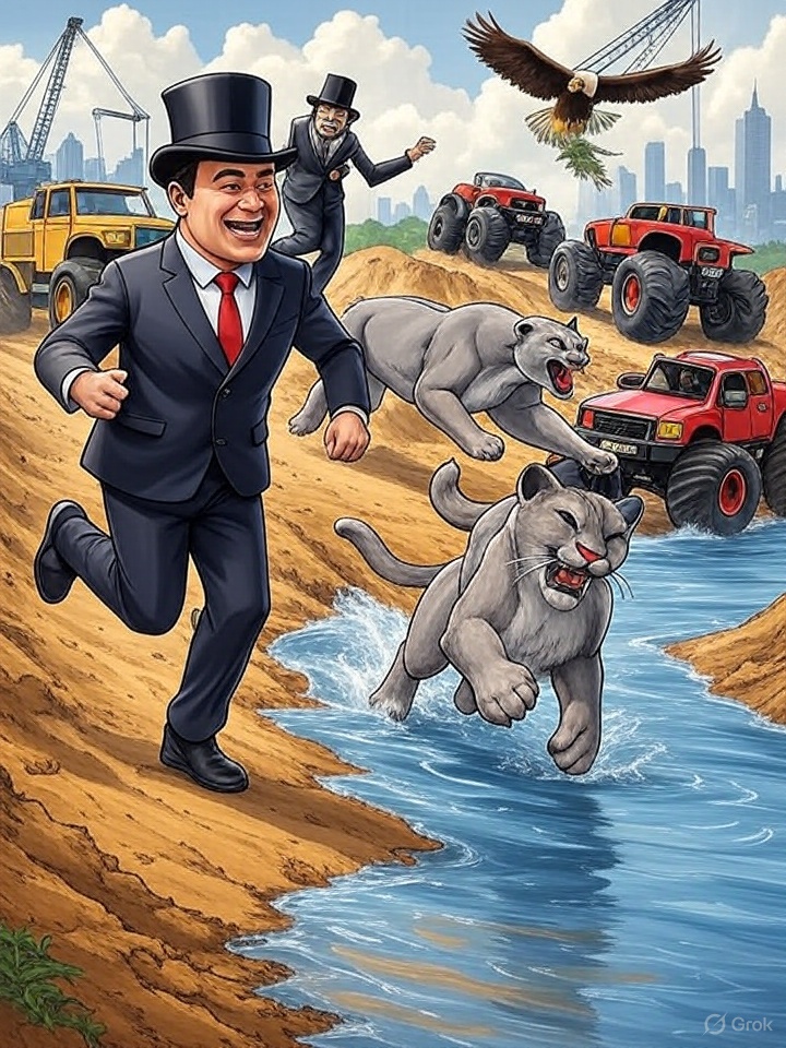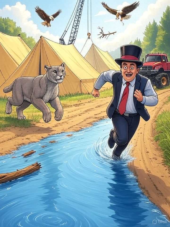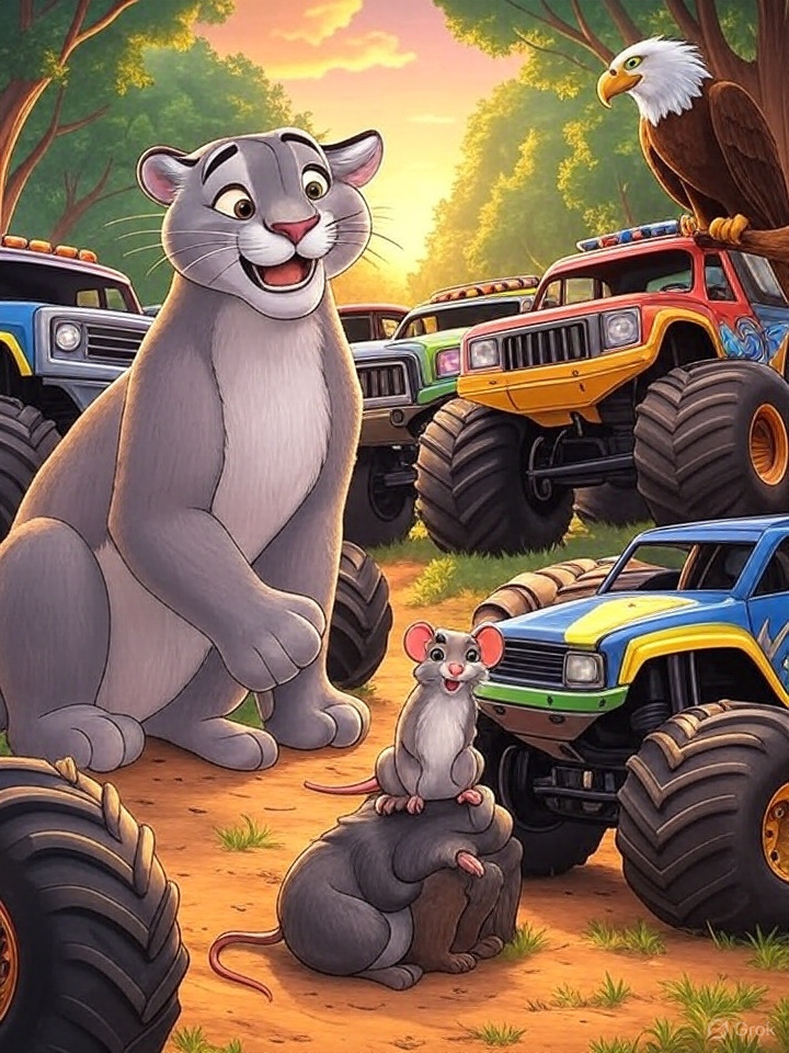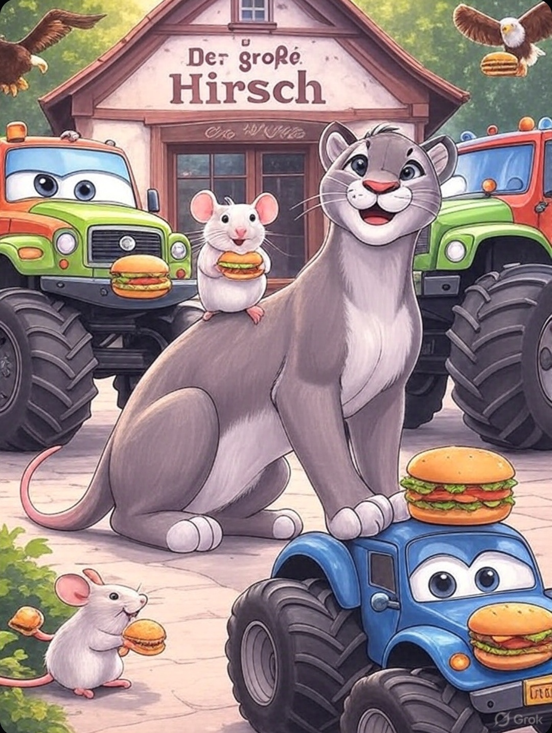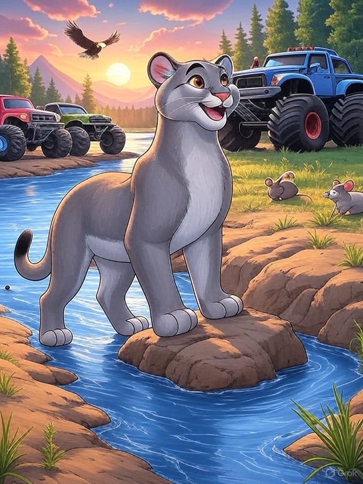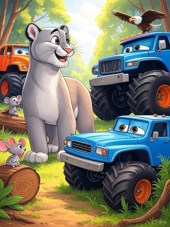 Im dichten Urwald, wo die Bäume hoch in den Himmel ragen und der Fluss gluckert wie ein fröhliches Lied, lebte ein Puma namens Pumatoni. Er war kein gewöhnlicher Puerto Rico Puma – er war mutig, schlau und hatte ein Herz so groß wie der Mond. Seine besten Freunde waren Frieda die Maus, flink und klug, Max der Adler, der mit scharfen Augen über den Urwald flog, und die Monstertruck-Gang, eine Gruppe von drei lauten, aber gutherzigen Trucks namens Rumpel, Brummel und Krach. Jeden Abend trafen sie sich im Restaurant „Der große Hirsch“, wo sie saftige Burger aßen und über ihre Abenteuer sprachen.
