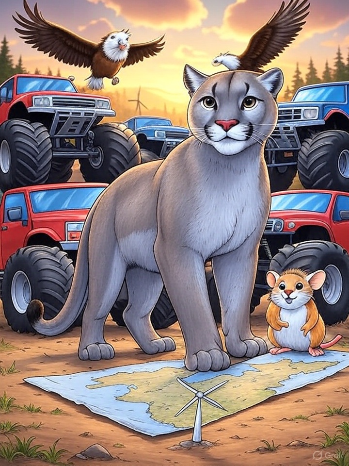 „Wir müssen etwas tun!“, sagte Pumatoni, während er an einem Hirsch-Burger knabberte. Frieda nickte, ihre kleinen Schnurrhaare zitterten vor Aufregung. „Ich habe eine Idee! Wir könnten den Bürgermeister überlisten!“ Max der Adler schwang seine Flügel. „Ich fliege hoch und sehe, was er plant!“ Die Monstertruck-Gang brummte zustimmend. „Wir rollen direkt hin und machen Krach, wenn’s nötig ist!“, sagte Rumpel.