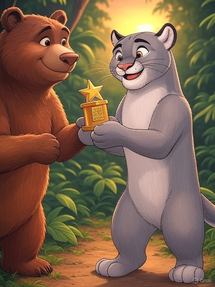 Der goldene Stern wurde verliehen – aber nicht nur an Pumatoni und seine Freunde, sondern an alle Tiere im Tal, weil sie geteilt und zusammengearbeitet hatten.
