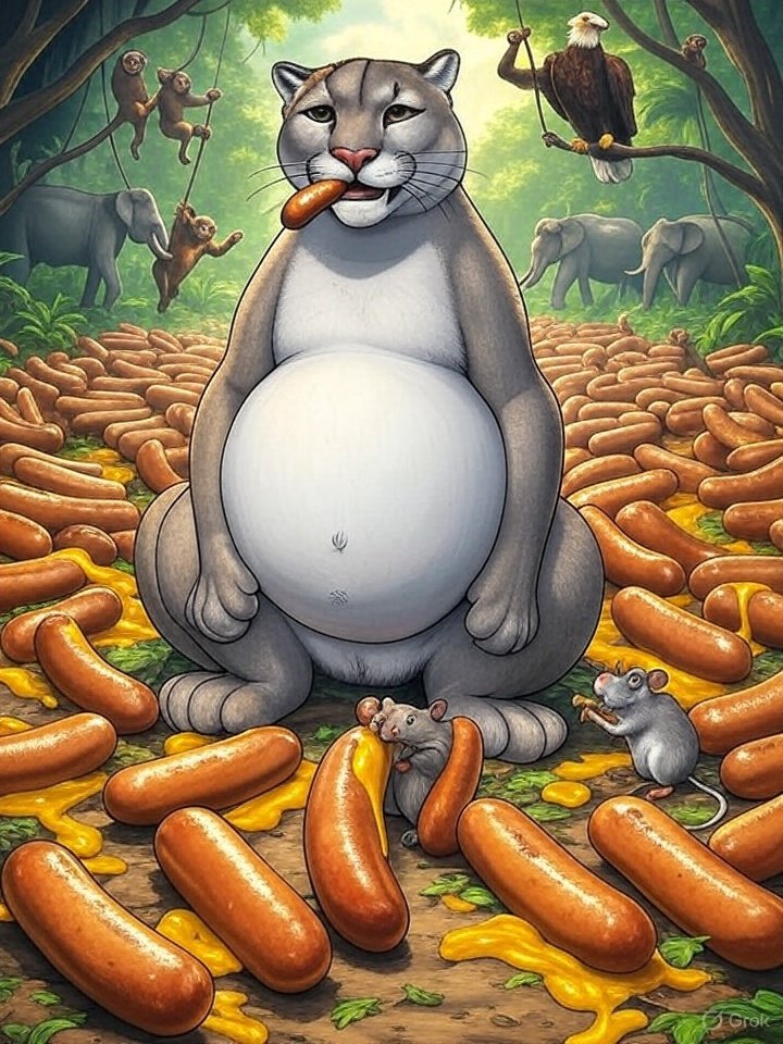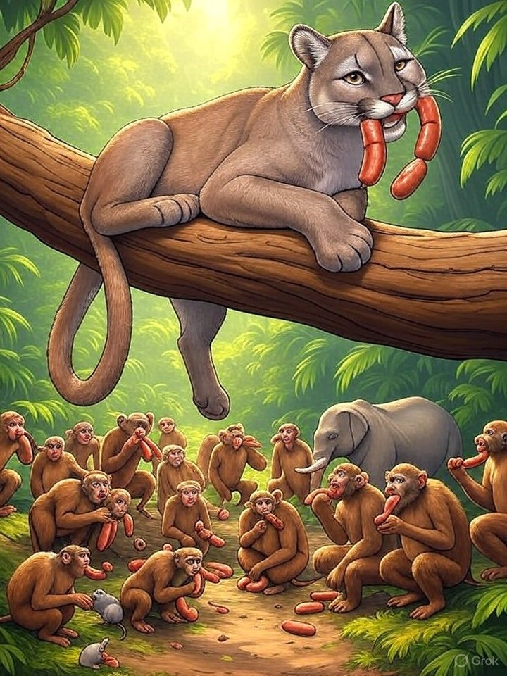 Pumatoni schnurrte zufrieden. „Das war lecker! Das war das beste Festmahl aller Zeiten!“ Frieda kuschelte sich an ihn, Max breitete stolz seine Flügel aus, und die Affenbande machte Purzelbäume vor Freude. Von da an wussten sie: Gemeinsam kann man alles schaffen – sogar 1000 Bratwürste!😋