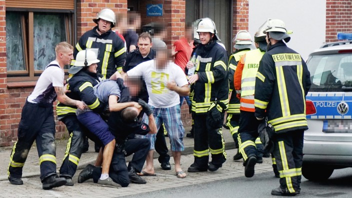 Anders ausgedrückt hat mal einer der Freunde einen über den Durst getrunken und ist ohnmächtig geworden. Ein Sanitäter wollte diesem Helfen und hatte dafür von einem anderen eine geklatscht bekommen.