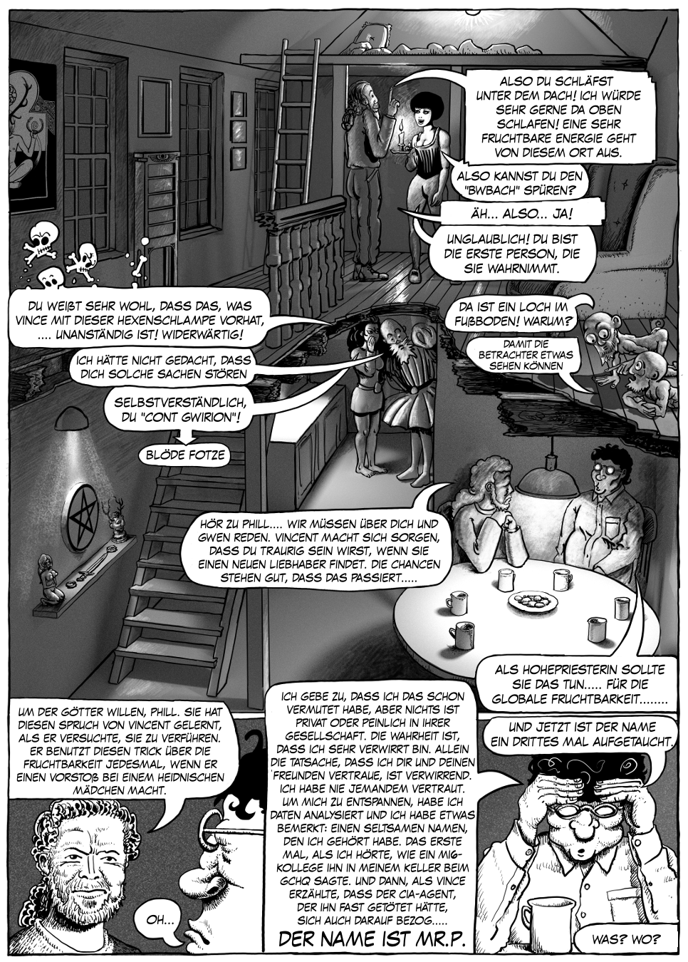 Aber was ist mit dem ursprünglichen MacGuffin: dem mysteriösen Mr.P., der in der Lage zu sein scheint, die Zukunft vorherzusagen? Nun..... Phill und seine Freunde können endlich wieder in richtigen Betten schlafen. Vincent Cavanaugh plant, in Raven Donoho's Bett zu schlafen, sehr zum Leidwesen seiner Hohepriesterin. Aber in der Zwischenzeit bemühen sich Morty und Phill, die Geschichte mit der Frage wieder auf den richtigen Weg zu bringen: Wer oder was ist Mr.P?! Wir werden dieser Frage auf der nächsten Seite näher kommen.