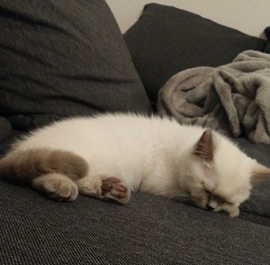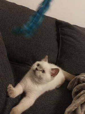 | Da Bailey noch eine sehr junge Katze ist, schläft er noch den größten Teil des Tages, aber wenn er wach ist, möchte er am liebsten die ganze Zeit beschäftigt werden. | |