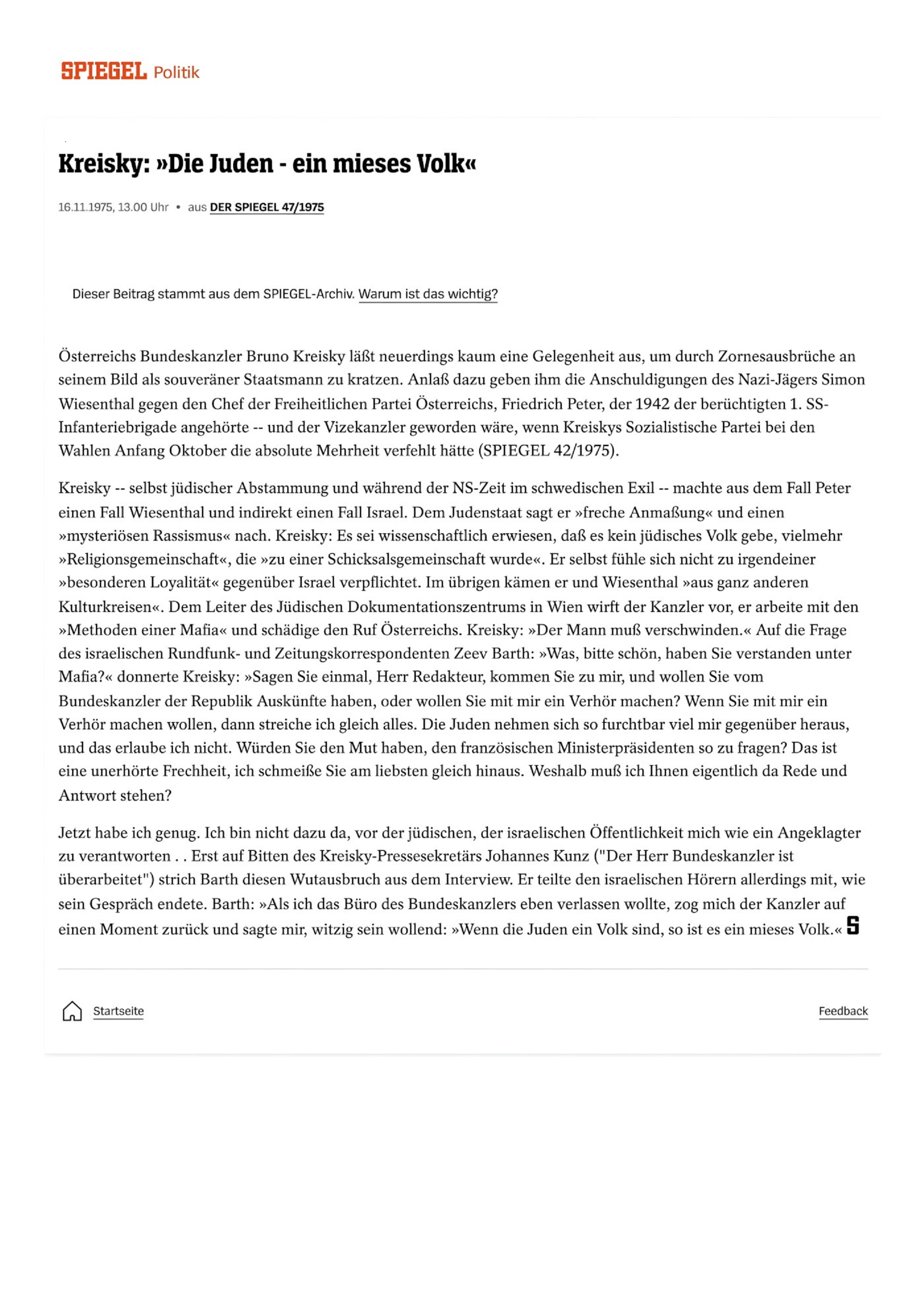 1975 wies der Bundeskanzler von Österreich den israelischen Rundfunk- und Zeitungskorrespondenten Zeev Barth in die Schranken, als dieser frech und anmaßend wurde. Das Magazin Der Spiegel berichtet darüber. Gerade in Zeiten, wo es scheint, nur mehr korrupte und substanzlose Politikmarionetten zu geben, ist es ein guter Anlass, dieses Stück wieder aus dem Archiv zu holen und die jüngere Generation davon in Kenntnis zu setzen.