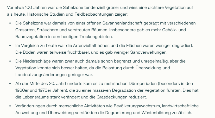 Selbst die KI gibt zu, dass es in der Sahelzone noch vor 100 Jahren grüner gewesen ist. Sie schreibt auch, dass es besonders in den 1960er und 1970er Jahren zu extremen Dürren kam. Was sie natürlich vergisst zu erwähnen, dass in dieser Zeit die Franzosen in der Sahra 17 Atomtests durchführten. Vier davon oberirdisch.
