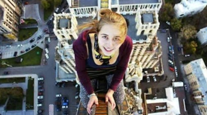 Eine 17-jährige Russin, die kurz nach der Aufnahme des Photos ihr Gleichgewicht verlor und abstürzte: