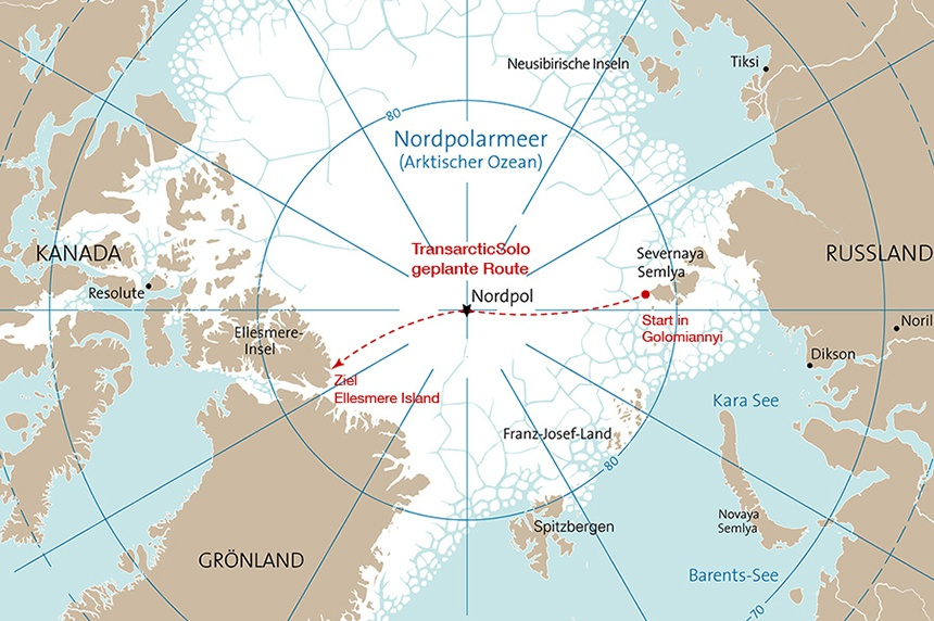 Er hat seine Arktisalleindurchquerung später "auf Eis" gelegt. Das wäre seine geplante Route gewesen Quelle: