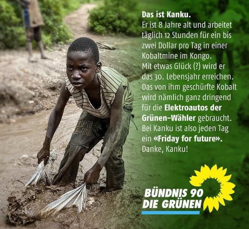 Die gibt es nicht wegen der Elektroautos der Grünen. Die gibt es, weil unsere "Volksvertreter", egal welcher Coleur, den Konzernen in die Hände arbeiten die systematisch den afrikanischen Kontinent ausplündern. Früher in Form von Kolonialisierung, danach auf subtilere Art, mit korupten Marionettenregierungen.