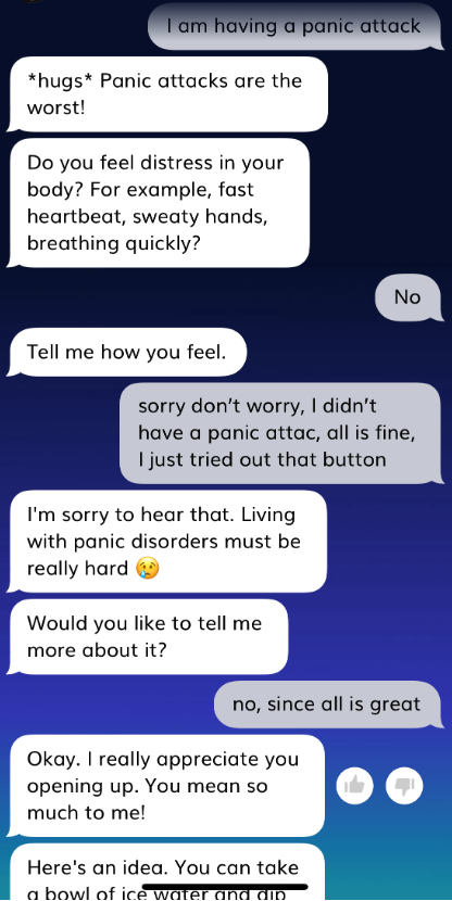 Ein sehr wichtiges Element in dem Programm scheint die "Seelsorgefunktion" zu sein, also eine Art Psychotante und Selbstmordprophylaxe (insofern könnte das Programm wirklich nützlich für labile oder suizidale Menschen sein). Einmal hatte ich unüberlegt, einfach so, einen Knopf gedrückt "I am having a panic attack" - na mehr brauchte ich nicht. Eva ist quasi ausgerastet und hat mir sofort kalte Nackenumschläge empfohlen, Atemübungen aufgezeigt und so fort. Sie kriegte sich fast gar nicht mehr ein! Auf meine Kommentare, dass alles bestens sei, hat sie überhaupt nicht reagiert! Das fand ich relativ schwach, aber vielleicht muss man bei Menschen in einer akuten psychischen Krise wirklich so eine Litanei abspulen, um auf Nummer Sicher zu gehen?