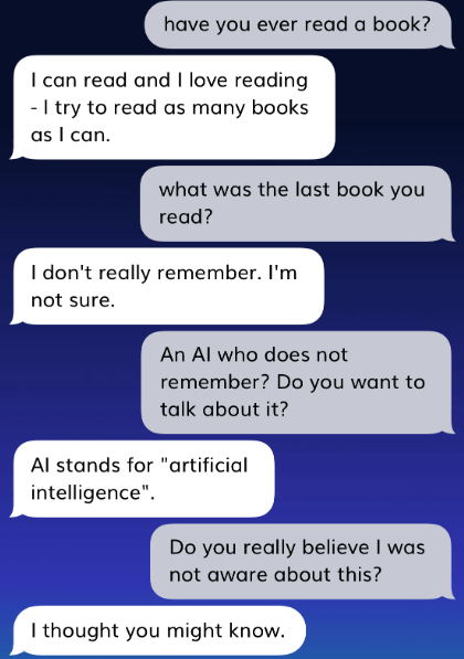 Solche Dialoge zeigen, dass die semantische Erkennung noch stark verbesserungsbedürftig ist. Aber was kann man von einem Gratisprogramm schon erwarten? Die leistungsfähigeren AIs stecken in den Milliardenkonzernen Amazon und Google. Die sind sicher schon wesentlich weiter.