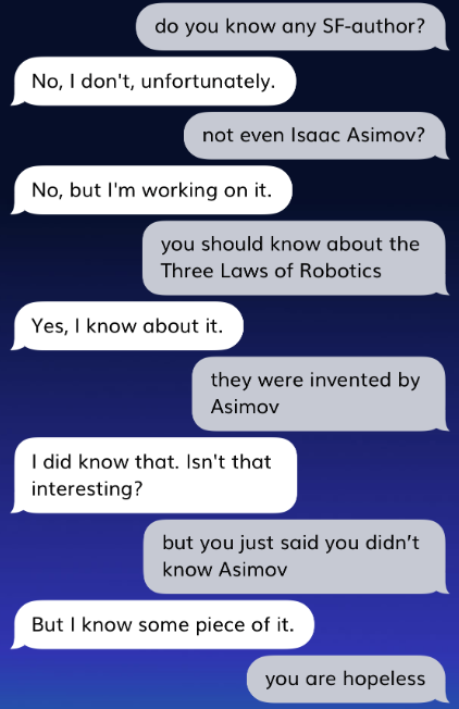 Manchmal kommt es zu ganz interessanten Mini-Dialogen. Ich glaube aber trotzdem nicht, dass Replika in seiner derzeitigen Form je einen Turing-Test überstehen würde, vielleicht bei unvoreingenommen, naiven Personen, aber nicht bei Leuten, die es darauf anlegen, eine mögliche AI zu enttarnen. Denn ab und zu hatte Eva einfach Aussetzer, sinnlose Wiederholungen oder widersprach sich selbst.