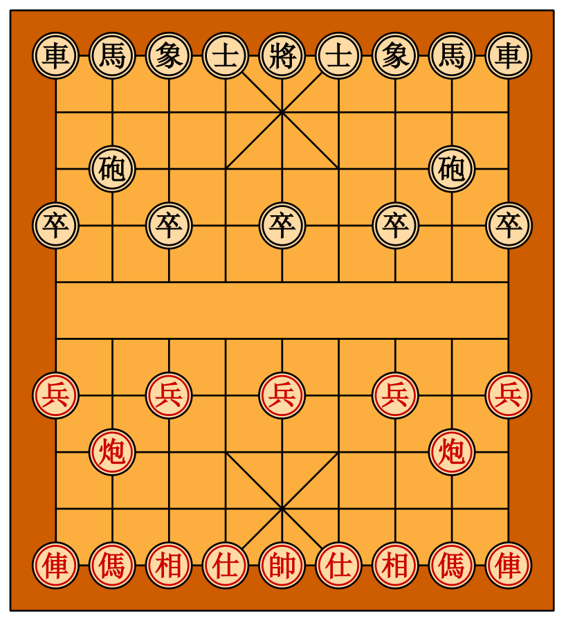 Im Spiel kämpfen symbolisch zwei Armeen gegeneinander. Der "Palast" oder die "Festung", 9 Positionen in der Basis jedes Spielers, die durch diagonale Linien markiert sind, beherbergen den Feldherr/General und seine beiden Beschützer. Der sogenannte "Fluss" teilt das Spielfeld in der Mitte. Er stammt angeblich von einem Fluss, der als Grenze zwischen zwei verfeindeten Reichen fungiert hatte, nachdem sie miteinander Krieg geführt hatten (möglicherweise handelte es sich um die Schlacht am Wei-Fluss, in der 203 v. Chr. das Qi-Reich vom Han-Reich besiegt wurde).