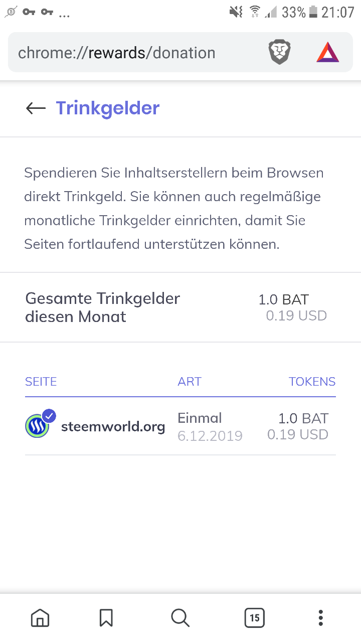 Oh fein! Steemworld ist für Brave BAT registriert. Na das soll man mir nicht zwei mal sagen!! Regelmäßiges Trinkgeld ist eingerichtet und ein 10 BAT Tip vorweg schon unterwegs!! !invest_vote