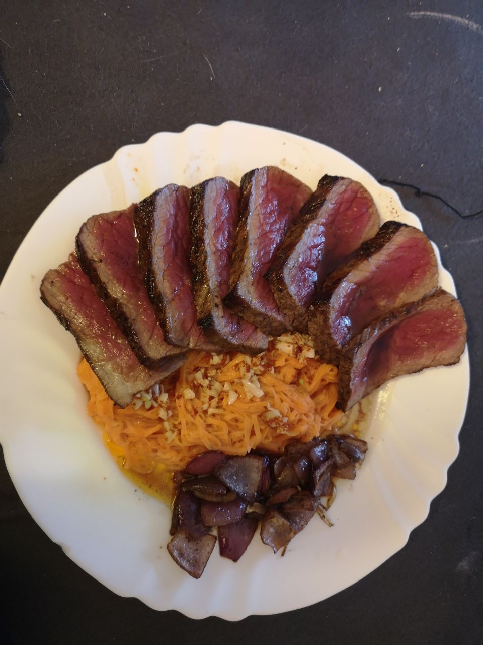 Nachdem ich auf die Idee gekommen bin eine Nudelmaschine zu bestellen und im Übermut etwa 2 Kilogramm an Nudeln hergestellt habe, gab es in letzter Zeit viele Nudeln, hier z.B. Steak mit gebratenen roten Zwiebeln und Tomatennudeln.