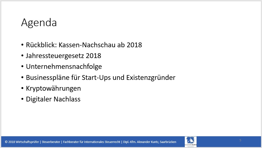 | nach langer Zeit melde ich mich mal wieder. Über Sommer habt Ihr kaum etwas von mir zu lesen bekommen. Ich habe in dieser Zeit nochmal viel recherchiert und gearbeitet. Und auch eine Informationsveranstaltung für meine Mandanten und weitere interessierte Personen durchgeführt. Im Folgenden zeige ich Euch die Agenda für den gestrigen Abend: | After a long time I am writing again. During summer you haven't got lots to read from me. During this time I have been doing lots of research and work. Additionally I have organised an informative meeting for my clients and other interested people. Please find the agenda of yesterday's meeting in the following picture: |