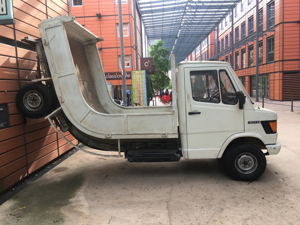Es sieht aus, als käme es direkt die Wand heruntergefahren. Tatsächlich hat sich hier ein Künstler sehr viel Mühe gegeben und das Metall ganz bewusst gebogen und gedehnt, so dass der LKW in dieser Form angelehnt und hingestellt werden konnte.