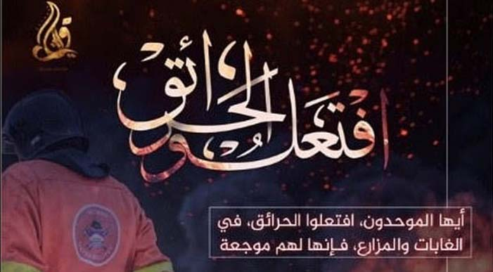 Der IS hat seine Fanatiker bzw. Sympathisanten aufgefordert, Waldbrände zu entfachen, um nach den historischen Sommerflammen in Kalifornien und Spanien ein ökologisches Chaos zu verursachen. Plakate von Quraysh, einem Sprachrohr des Islamischen Staates, haben die Befürworter ermutigt, im Rahmen seines Dschihad "Feuer zu entzünden".