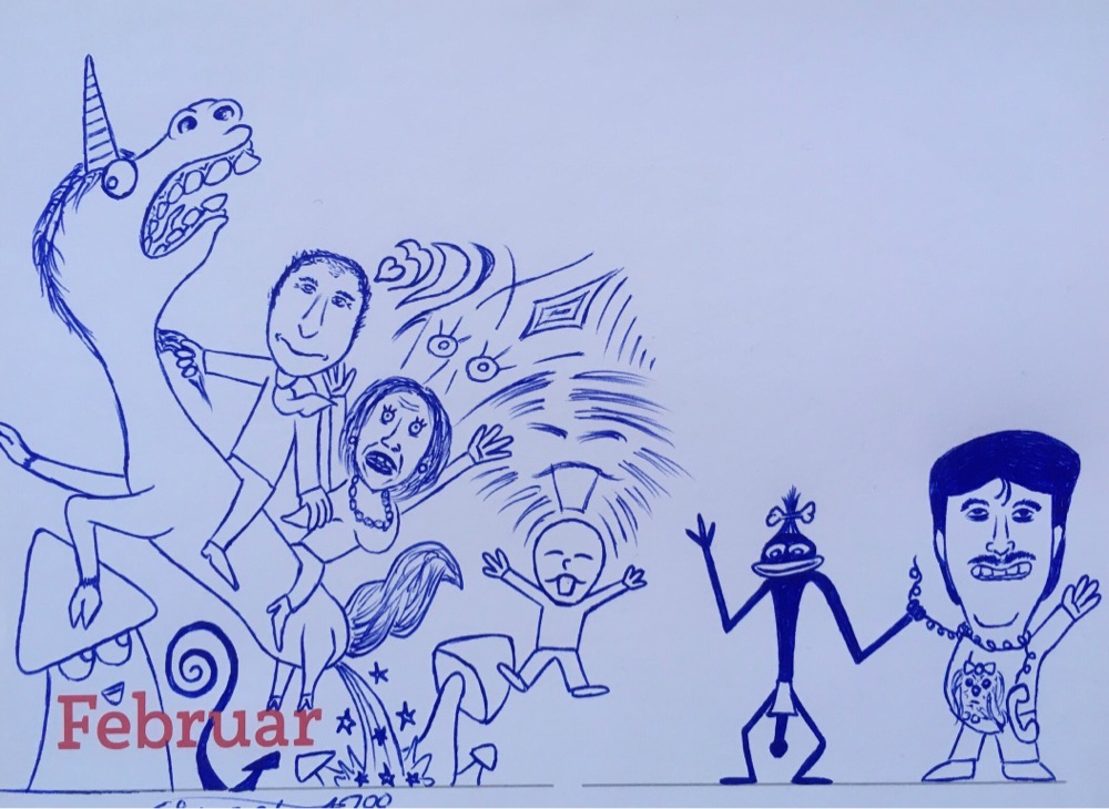 Die letzten Stichwörter waren „Putin reitet mit Pelosi auf einem Einhorn durch das Wunderland von Alice” von @hansgans, “Psychedelic” von @feuerelfe, “Mooshammer mit Hund” und „Quotenschwarzer“ von @fredfettmeister sowie “Asiate“ von @luegenbaron