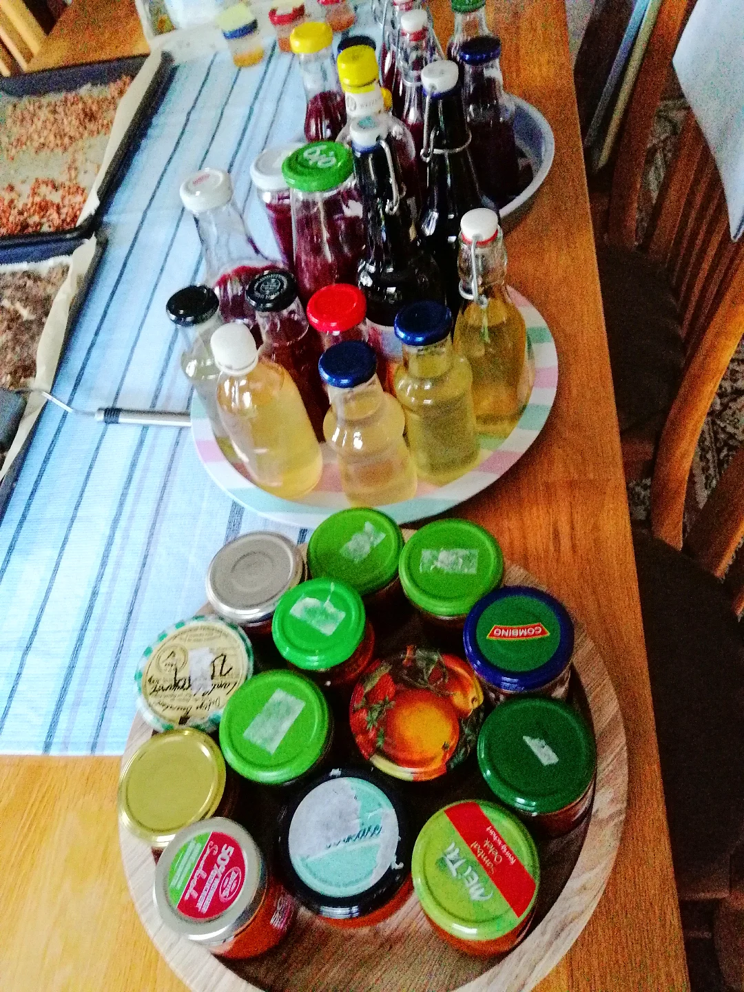 Der Esstisch ist zur Zeit wieder Parkplatz für diverses was trocknen soll, Gläser mit Tomatensamen, Ablagefläche für Einmachzubehör😅. Die Flaschen und Gläser müssen noch beschriftet werden, bis dahin stehen sie ebenfalls auf dem Tisch 🤪.