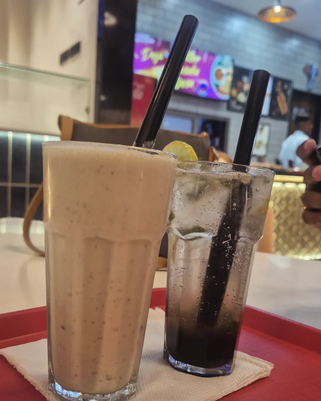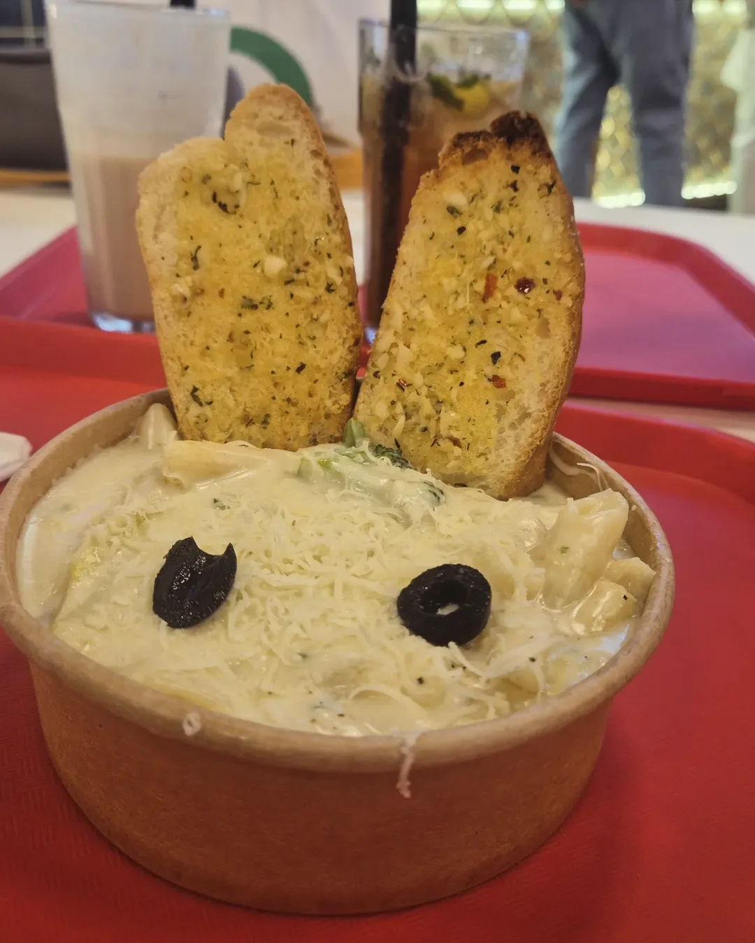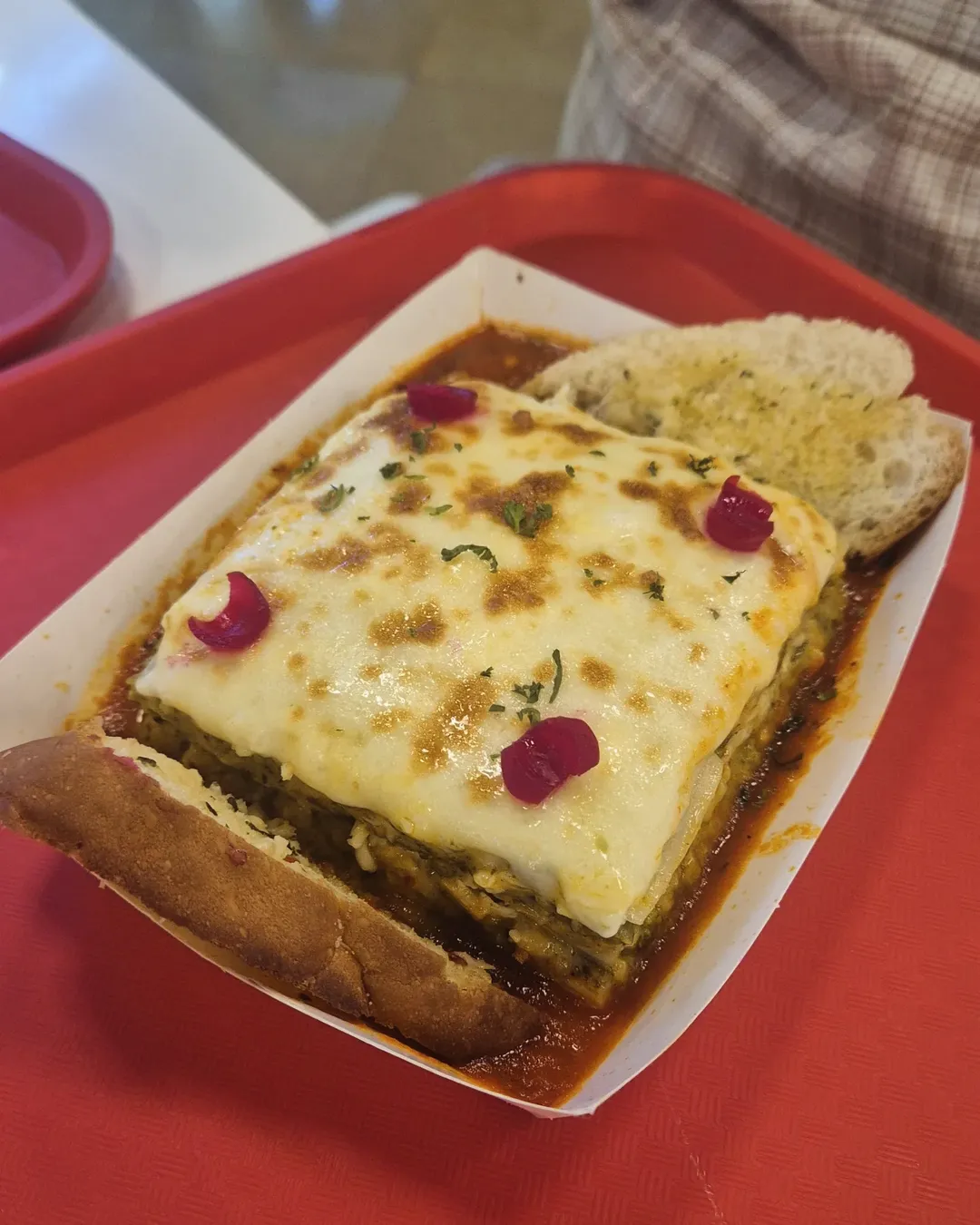 Komfort auf dem Teller: Käse-Lasagne, cremige Pasta mit weißer Soße und Knoblauchbrot, ein gekühltes Getränk und ein reichhaltiger Schokoladenshake als krönender Abschluss!😅❤️.