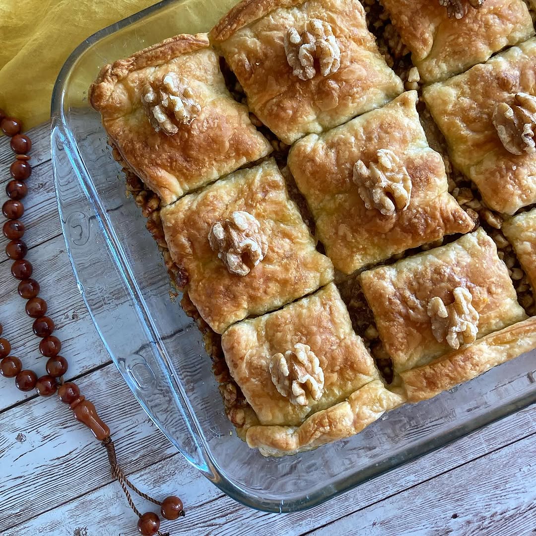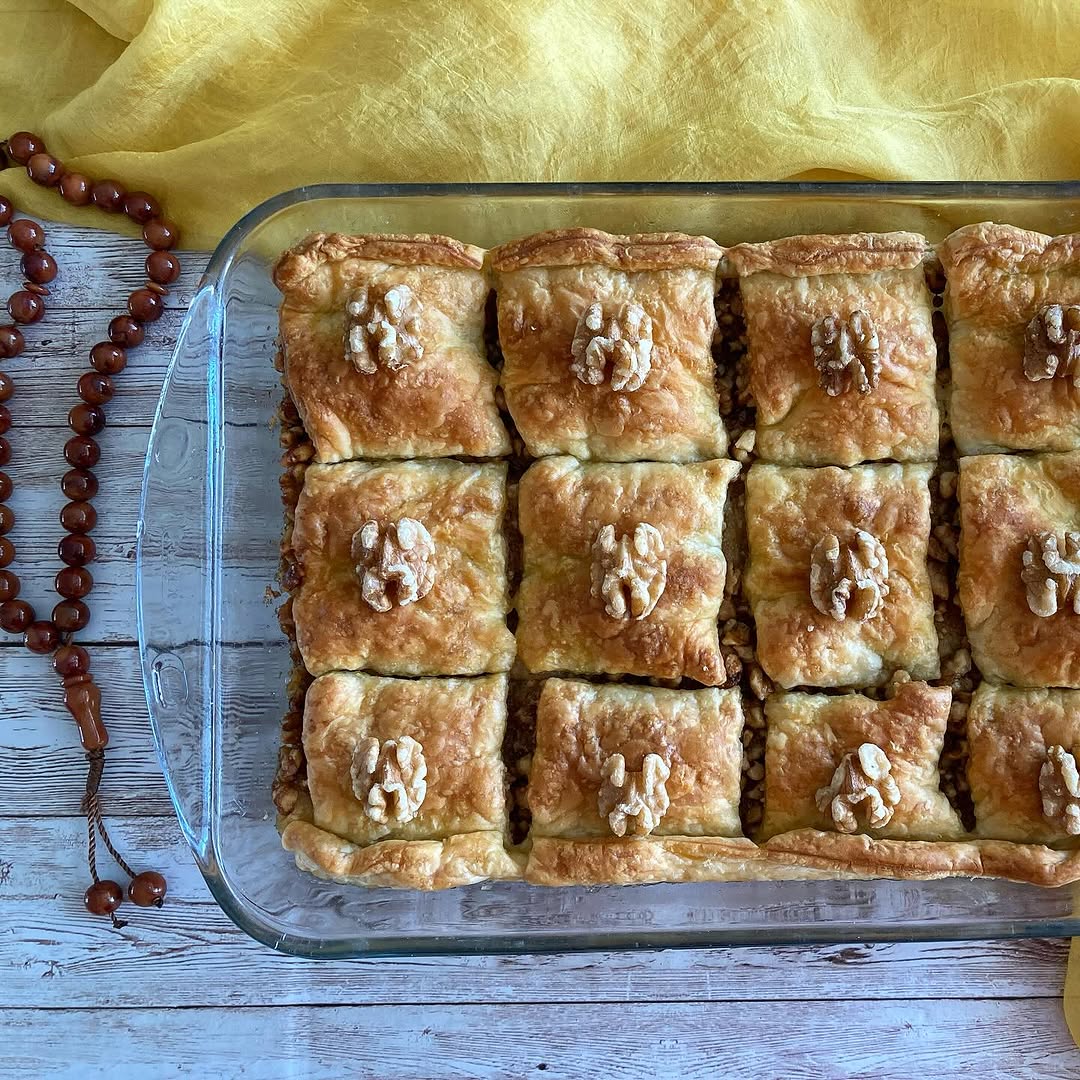 dieses Baklava ist mit einfachem Blätterteig und Honig gemacht, hat also deutlich weniger Zucker als das herkömmliche. Noch dazu kann man Blätterteig in jedem Laden kaufen und muss dafür nicht extra in den türkischen Supermarkt.