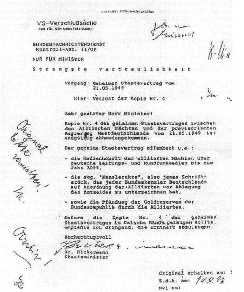 Geheimdienstliches Dokument über den Verlust eines Exemplars der sogenannten "Kanzlerakte". Auch ist hierdurch ersichtlich, weshalb es im Besatzungsgebiet nur gleichgeschaltete "BRD"-Medien mit alliiertem Maulkorb geben kann, und keine freie Presse. Das dargestellte geheimdienstliche Dokument ist durch eine Indiskretion an die Öffentlichkeit gelangt, es ist deshalb als Quelle juristisch nicht zitierfähig. Sofern der interessierte Leser Zweifel an der Echtheit dieses Dokumentes hat, möge er dies aus seinem Gedächtnis streichen.