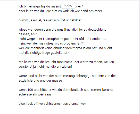 Also was tun ? Immer öfter werden Provokateure eingeschleust, um zumindest ab und zu im Westen strafbare Äußerungen zu erhaschen und dann vielleicht mittels Tracking von VK zu FB oder Twitter doch die IP herauszufinden. Sagt man diesen Typen auf den Kopf hin zu, daß sie Spitzel sind und man die User vor ihnen warnen wird, dann ergibt das meist eine sofortige Userblockade - also gegebenenfalls immer vorher Screenshots anfertigen ! - und danach solche Meldungen in der Privat-Box, die so ziemlich die gesamte Persönlichkeit eines linxgrünen Gutmenschen mit typischen 3 Followern wiedergeben: von der Intelligenz über die Bildung bis hin zur nicht mehr zügelbaren Wut darüber, daß sie mit ihren üblichen Zensur- und Meldekeulen im Sozialen Lande Putins nichts ausrichten können. Der blanke Haß eben ! Herrlich, sie so zappeln zu sehen.