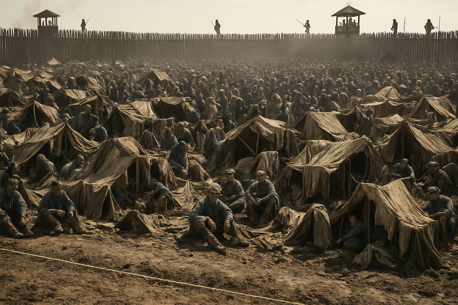 Das Camp Sumter in Georgia, besser bekannt als 𝓐𝓷𝓭𝓮𝓻𝓼𝓸𝓷𝓿𝓲𝓵𝓵𝓮, war die Hölle auf Erden. Auf 10 Hektar pferchte Wirz zeitweise 33.000 Kriegsgefangene zusammen - das sind über 3.000 Menschen pro Hektar! 📊 Zum Vergleich: Ein modernes Fußballstadion fasst auf ähnlicher Fläche "nur" 75.000 Zuschauer - mit Sitzen, Sanitäranlagen und Verpflegung.