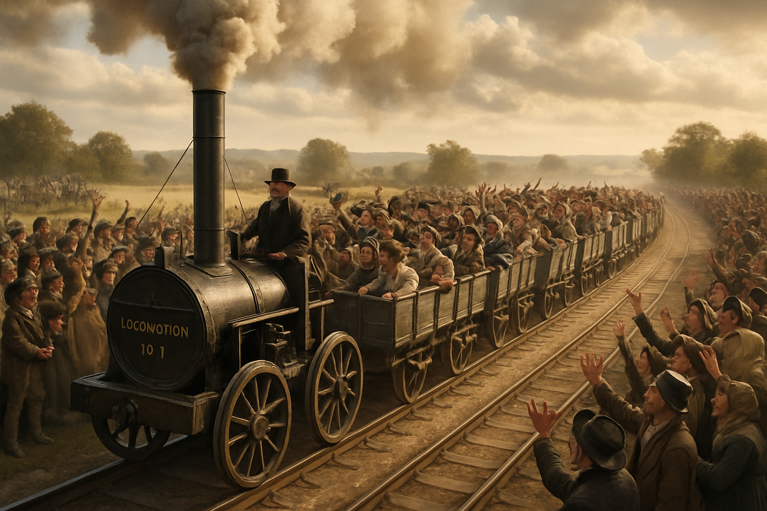 George Stephenson höchstpersönlich steuerte seine 𝓛𝓸𝓬𝓸𝓶𝓸𝓽𝓲𝓿𝓮 "Locomotion No. 1" über die 40 Kilometer lange Strecke. Was niemand erwartet hatte: Hunderte von neugierigen Menschen sprangen spontan auf die Waggons auf! 😱 Aus dem geplanten Güterzug wurde die erste Personenbeförderung der Eisenbahngeschichte.