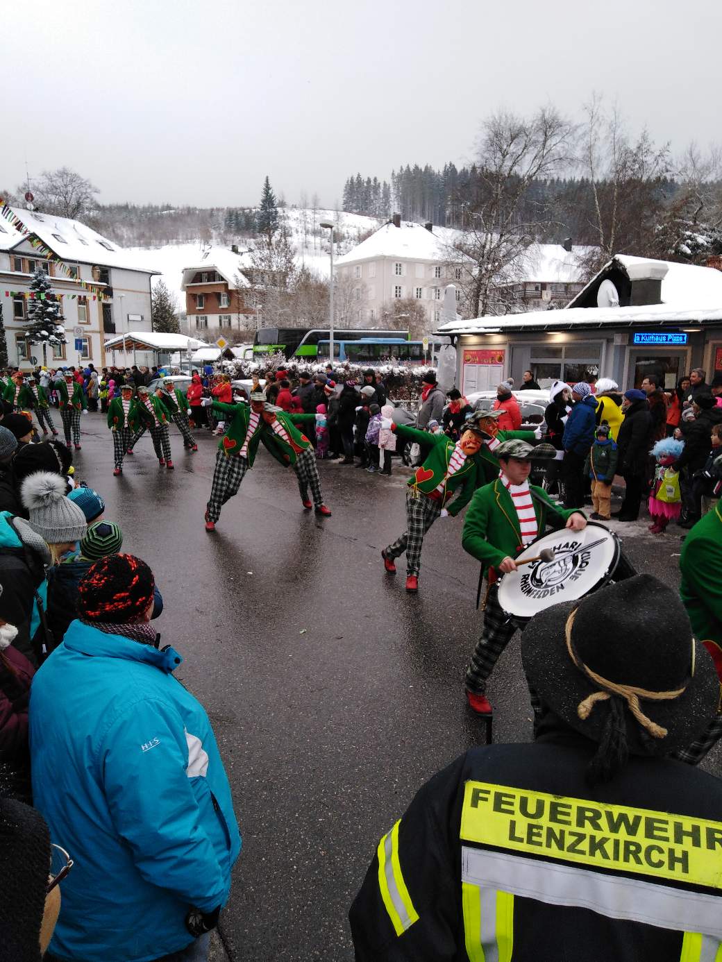 Der Narrenverein der Stadt Lenzkirch hatte dieses Jahr 150 jähriges Jubiläum. Das ganze Wochenende war halli galli. Sonntag morgen beim Brötchen holen waren sie schon um 7 Uhr am Sitzung halten. So laut, dass man es zwei Straßen weiter gut verstanden hat.