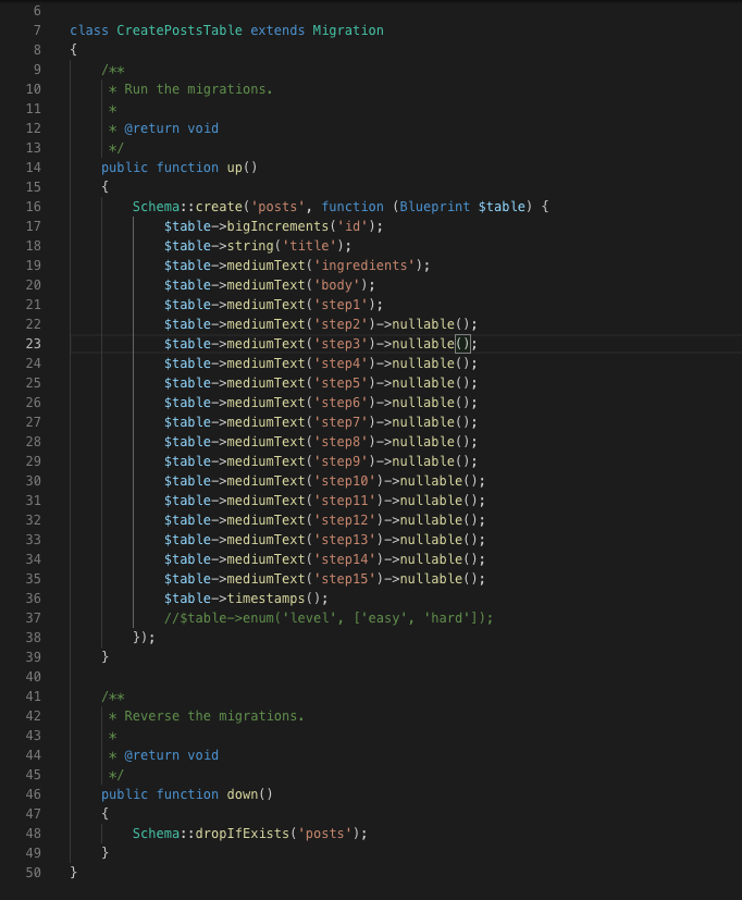 Creating the CRUD functionality took many steps including DB migrations (like the scruffy-looking one here):