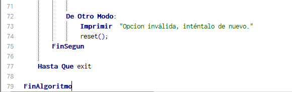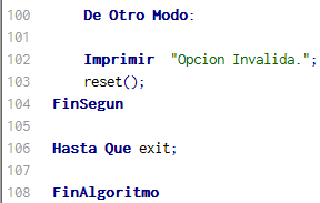 Si la variable opt no tiene ninguno de los valores contemplados en los 5 casos, entonces se procede a mostrar el mensaje **"Opción Invalida."; ** y procedemos a cerrar la estructura según, la estructura de repetición y cerramos el algoritmo.
