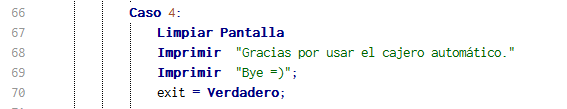 El caso 4, corresponde a la salida del programa, por lo que si el usuario introduce el numero 4, se limpiara la pantalla y se mostrara un mensaje de despedida. También se le asignara el valor verdadero a la variable exit que es la que le da el fin a la repeticion.