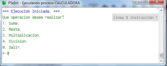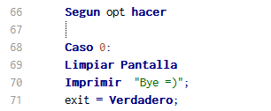 Así que el caso 0, permite evaluar el valor de la variable opt, si el usuario introduce un 0, se procederá a limpiar la pantalla y a mostrar un mensaje de despedida, y al asignarle el valor verdadero a la variable exit, se cerraría la repetición del ciclo y finalizaría el programa.