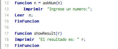 Continuamos con la creación de la Funcion n = askNum(n) para solicitar los números para realizar las diferentes operaciones. En esta, se imprime un mensaje solicitando al usuario que introduzca un número y se lee dicho valor el cual se almacena en la variable n.